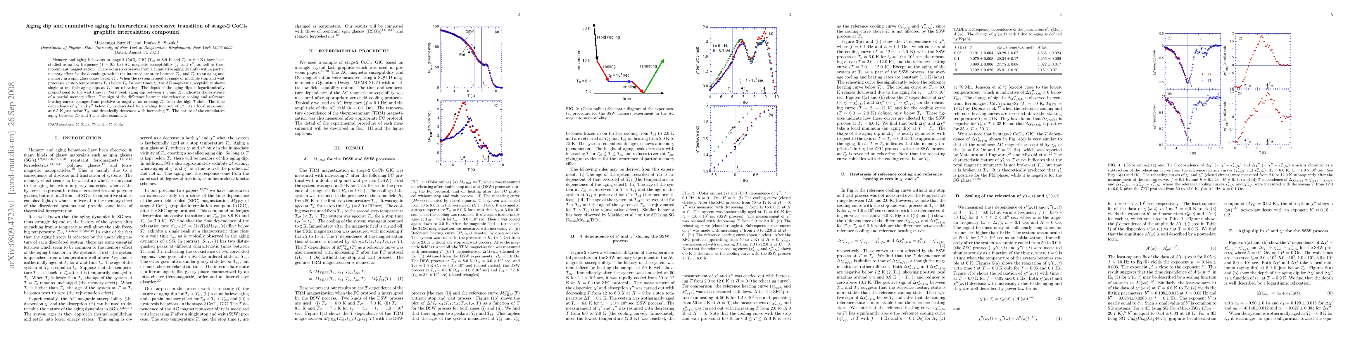 Memory and aging behaviors in stage-2 CoCl$_{2}$ GIC ($T_{cu}$ = 8.9 K and $T_{cl}$ = 6.9 K) have been studied using low frequency ($f$ = 0.1 Hz) AC magnetic susceptibility ($\chi^{\prime}$ and $\chi^{\prime\prime}$) as well as thermoremnant magnetization. There occurs a crossover from a cumulative aging (mainly) with a partial memory effect for the domain-growth in the intermediate state between $T_{cu}$ and $T_{cl}$ to an aging and memory in a spin glass phase below $T_{cl}$. When the system is aged at single or multiple stop and wait processes at stop temperatures $T_{s}$'s below $T_{cl}$ for wait times $t_{s}$, the AC magnetic susceptibility shows single or multiple aging dips at $T_{s}$'s on reheating. The depth of the aging dips is logarithmically proportional to the wait time $t_{s}$. Very weak aging dip between $T_{cu}$ and $T_{cl}$ indicates the existence of a partial memory effect. The sign of the difference between the reference cooling and reference heating curves changes from positive to negative on crossing $T_{cl}$ from the high $T$-side. The time dependence of $\chi^{\prime}$ and $\chi^{\prime\prime}$ below $T_{cl}$ is described by a scaling function of $\omega t$. its a local maximum at 6.5 K just below $T_{cl}$, and drastically decreases with increasing $T$. The nature of the cumulative aging between $T_{cl}$ and $T_{cu}$ is also examined.