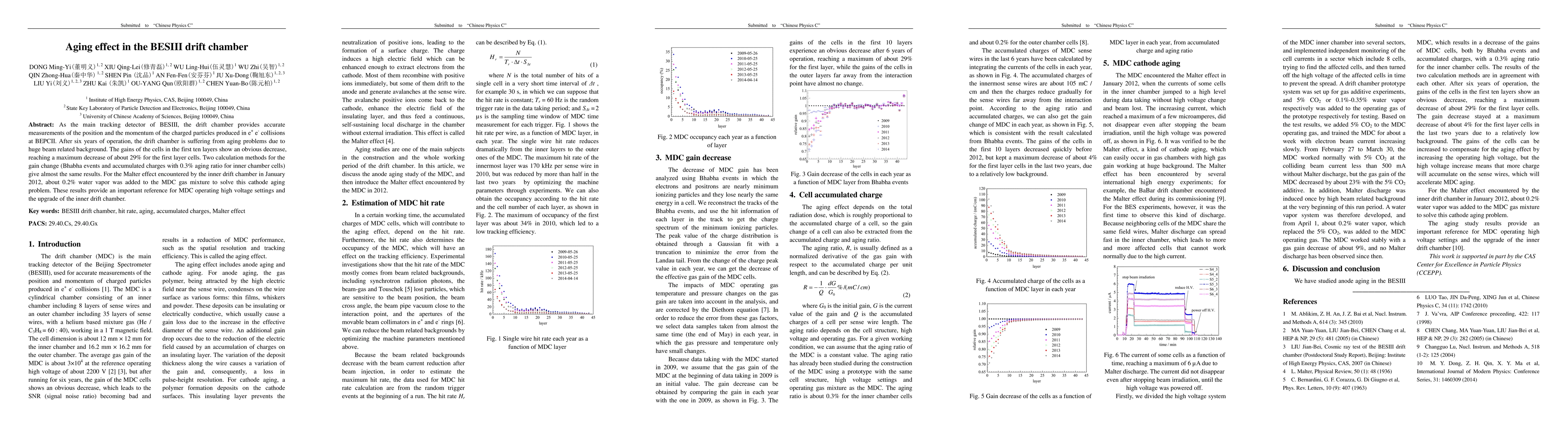 The BESIII drift chamber, used for tracking and momentum measurements, shows significant aging after six years of operation, with a 29% decrease in the first layer cell gains. Solutions like adding 0.2% water vapor to the gas mixture helped mitigate the Malter effect, providing crucial data for future high voltage settings and chamber upgrades.