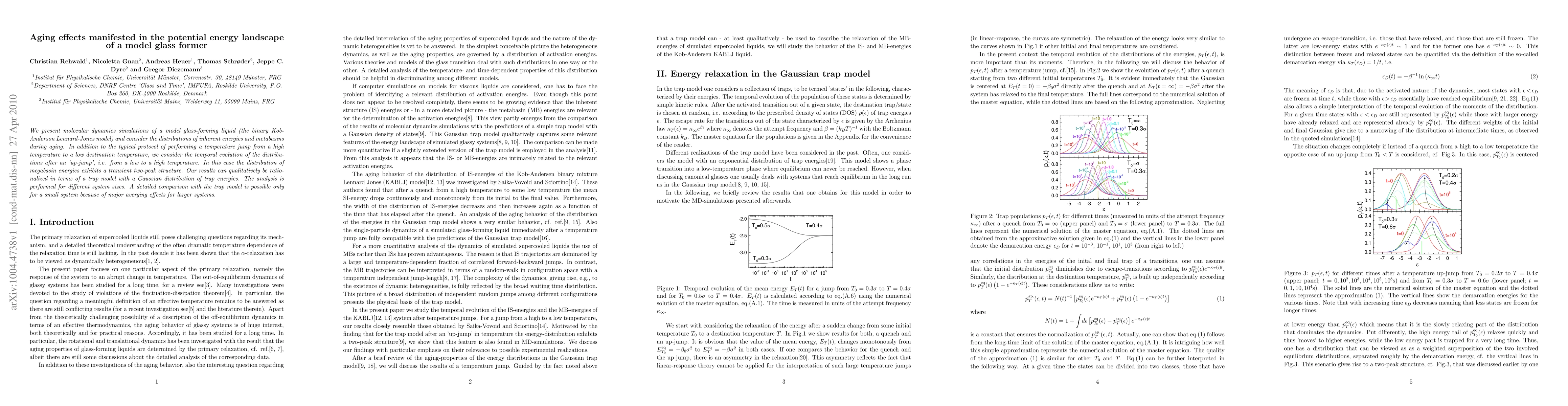 This study uses molecular dynamics simulations of a Kob-Anderson Lennard-Jones model to explore aging effects in glass-forming liquids. It reveals a transient two-peak structure in mega-basin energy distribution after an up-jump, explainable via a trap model with Gaussian trap energies. The analysis is conducted for various system sizes, with detailed comparisons feasible only for smaller systems due to averaging effects.