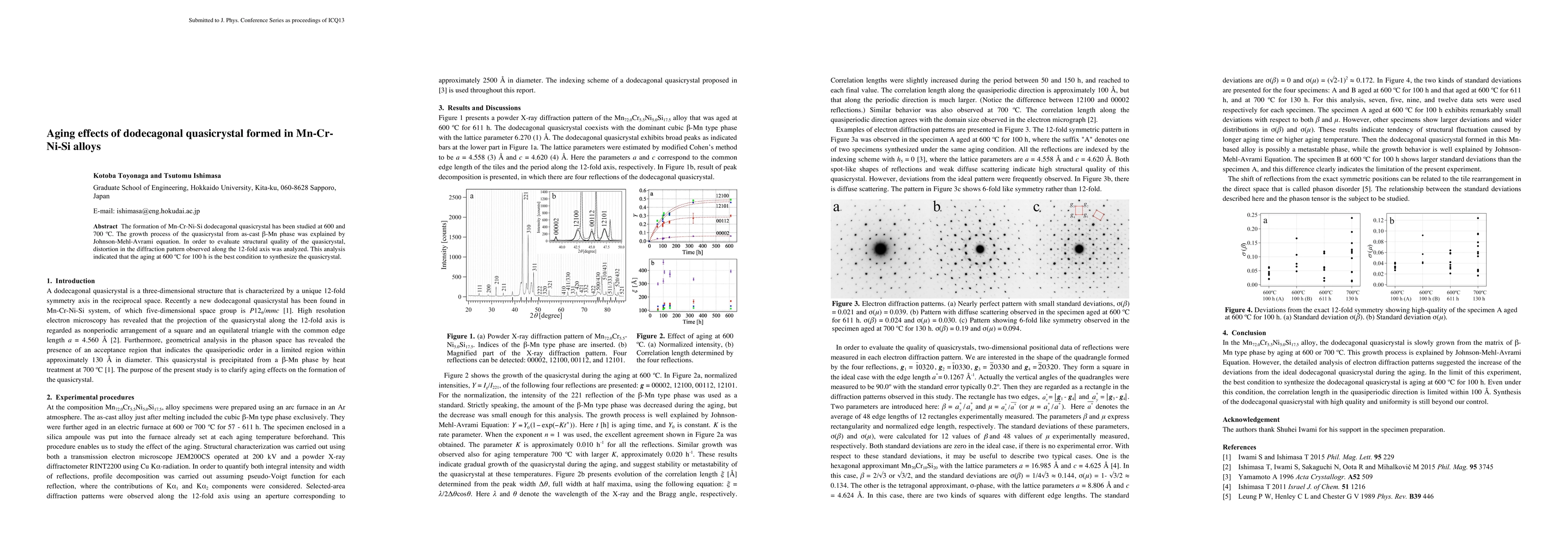 This study investigates the formation and aging effects of dodecagonal quasicrystals in Mn-Cr-Ni-Si alloys at 600 and 700°C, finding that aging at 600°C for 100 hours yields the best structural quality, as evidenced by minimal distortion in diffraction patterns.