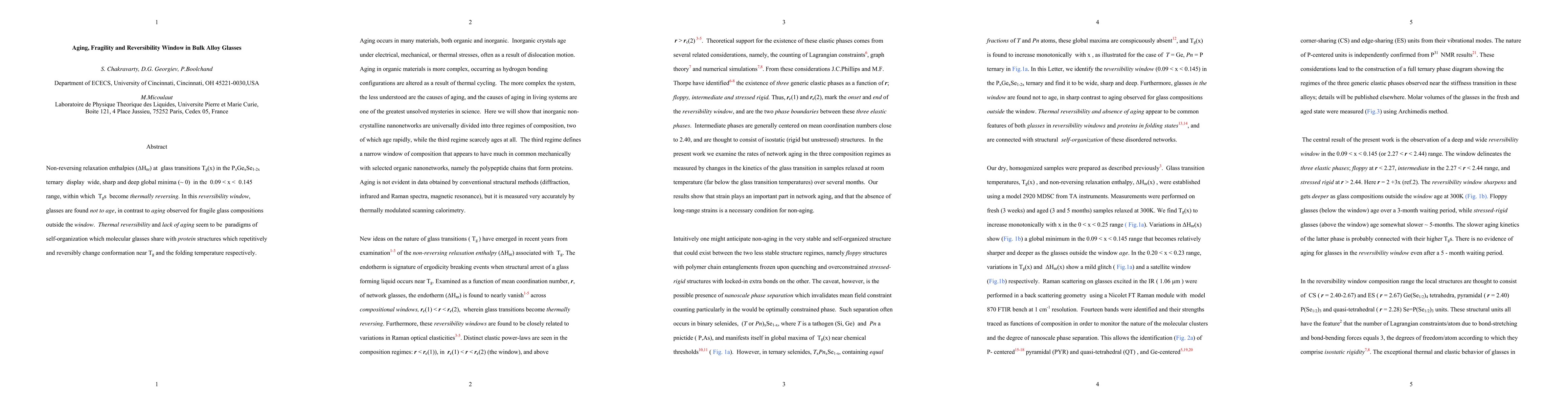 Non-reversing relaxation enthalpies (DHnr) at glass transitions Tg(x) in the PxGexSe1-2x ternary display wide, sharp and deep global minima (~ 0) in the 0.09 < x < 0.145 range, within which Tgs become thermally reversing. In this reversibility window, glasses are found not to age, in contrast to aging observed for fragile glass compositions outside the window. Thermal reversibility and lack of aging seem to be paradigms of self-organization which molecular glasses share with protein structures which repetitively and reversibly change conformation near Tg and the folding temperature respectively.