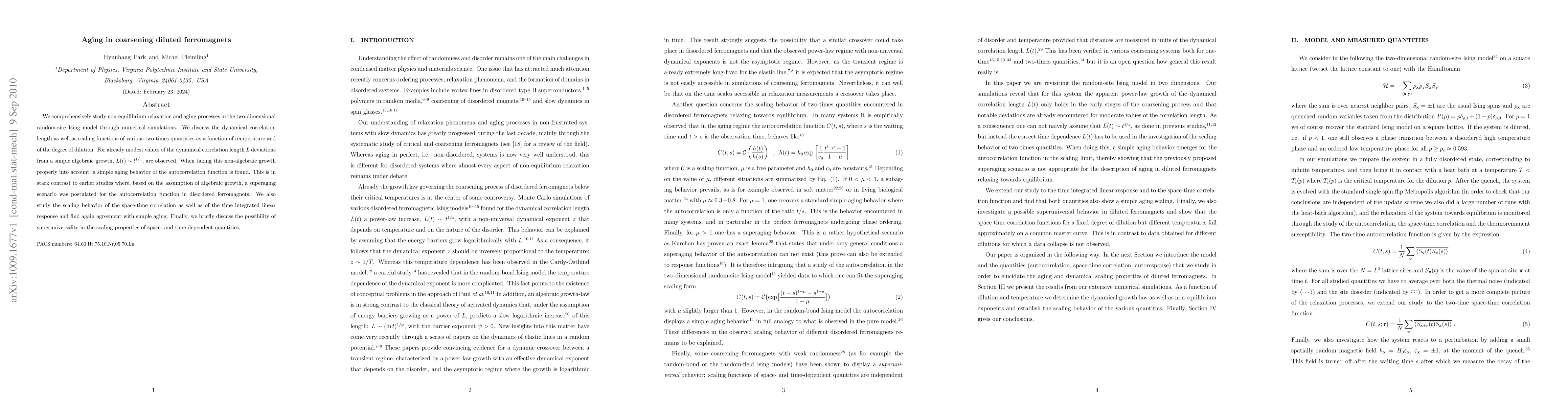 We comprehensively study non-equilibrium relaxation and aging processes in the two-dimensional random-site Ising model through numerical simulations. We discuss the dynamical correlation length as well as scaling functions of various two-times quantities as a function of temperature and of the degree of dilution. For already modest values of the dynamical correlation length $L$ deviations from a simple algebraic growth, $L(t) \sim t^{1/z}$, are observed. When taking this non-algebraic growth properly into account, a simple aging behavior of the autocorrelation function is found. This is in stark contrast to earlier studies where, based on the assumption of algebraic growth, a superaging scenario was postulated for the autocorrelation function in disordered ferromagnets. We also study the scaling behavior of the space-time correlation as well as of the time integrated linear response and find again agreement with simple aging. Finally, we briefly discuss the possibility of superuniversality in the scaling properties of space- and time-dependent quantities.
