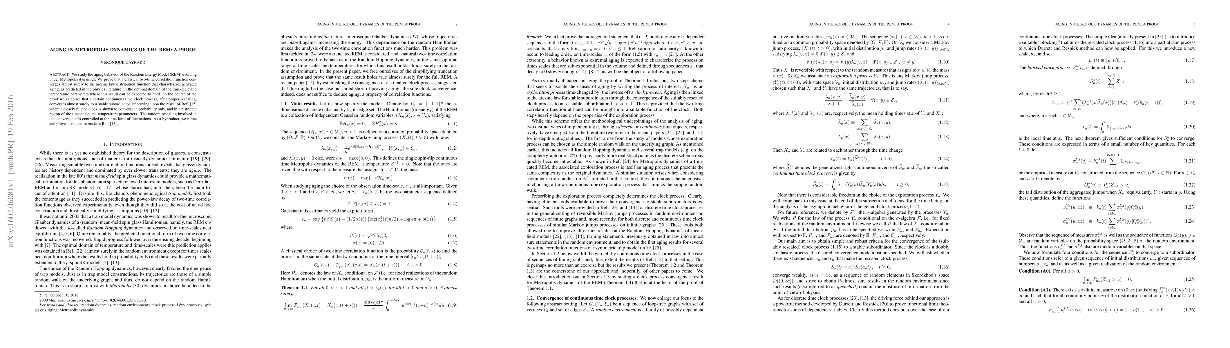 This paper investigates the aging dynamics of the Random Energy Model under Metropolis dynamics, proving that the two-time correlation function converges to the arcsine law, characterizing activated aging. It establishes that a rescaled continuous time clock process converges to a stable subordinator, enhancing prior work by refining a conjecture and controlling random rescaling.