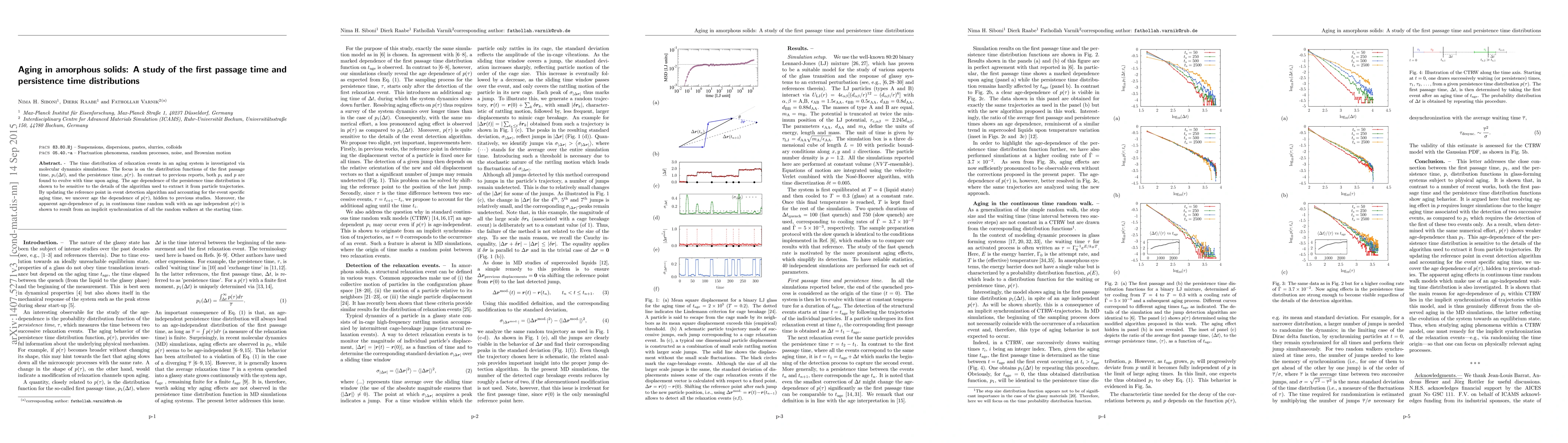 The time distribution of relaxation events in an aging system is investigated via molecular dynamics simulations. The focus is on the distribution functions of the first passage time, $p_1(\Delta t)$, and the persistence time, $p(\tau)$. In contrast to previous reports, both $p_1$ and $p$ are found to evolve with time upon aging. The age dependence of the persistence time distribution is shown to be sensitive to the details of the algorithm used to extract it from particle trajectories. By updating the reference point in event detection algorithm and accounting for the event specific aging time, we uncover age dependence of $p(\tau)$, hidden to previous studies. Moreover, the apparent age-dependence of $p_1$ in continuous time random walk with an age independent $p(\tau)$ is shown to result from an implicit synchronization of all the random walkers at the starting time.