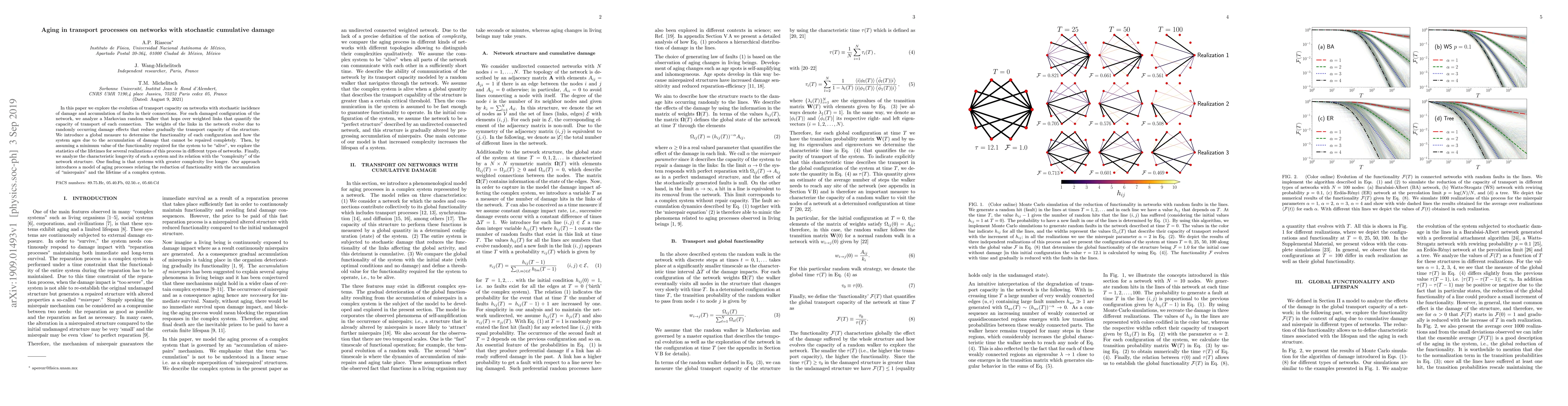 In this paper we explore the evolution of transport capacity on networks with stochastic incidence of damage and accumulation of faults in their connections. For each damaged configuration of the network, we analyze a Markovian random walker that hops over weighted links that quantify the capacity of transport of each connection. The weights of the links in the network evolve due to randomly occurring damage effects that reduce gradually the transport capacity of the structure. We introduce a global measure to determine the functionality of each configuration and how the system ages due to the accumulation of damage that cannot be repaired completely. Then, by assuming a minimum value of the functionality required for the system to be "alive", we explore the statistics of the lifetimes for several realizations of this process in different types of networks. Finally, we analyze the characteristic longevity of such a system and its relation with the "complexity" of the network structure. One finding is that systems with greater complexity live longer. Our approach introduces a model of aging processes relating the reduction of functionality with the accumulation of "misrepairs" and the lifetime of a complex system.