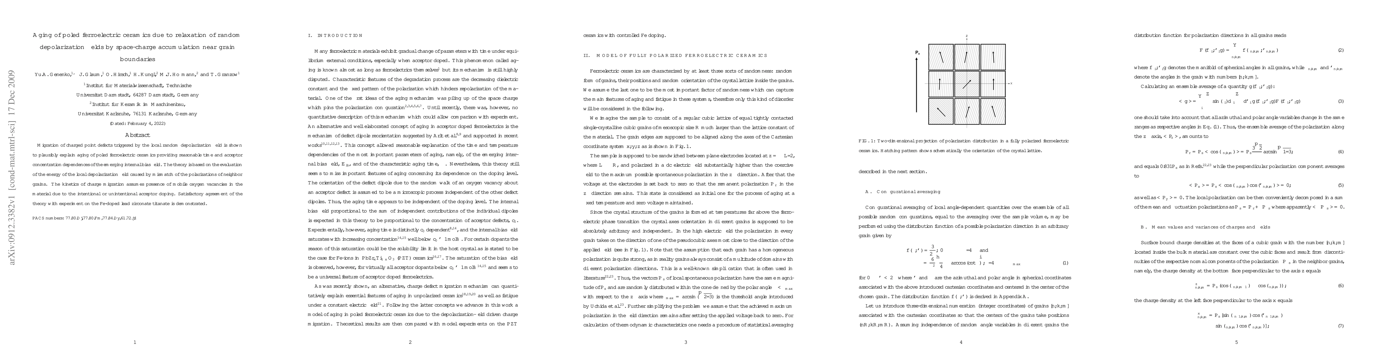 Migration of charged point defects triggered by the local random depolarization field is shown to plausibly explain aging of poled ferroelectric ceramics providing reasonable time and acceptor concentration dependences of the emerging internal bias field. The theory is based on the evaluation of the energy of the local depolarization field caused by mismatch of the polarizations of neighbor grains. The kinetics of charge migration assumes presence of mobile oxygen vacancies in the material due to the intentional or unintentional acceptor doping. Satisfactory agreement of the theory with experiment on the Fe-doped lead zirconate titanate is demonstrated.