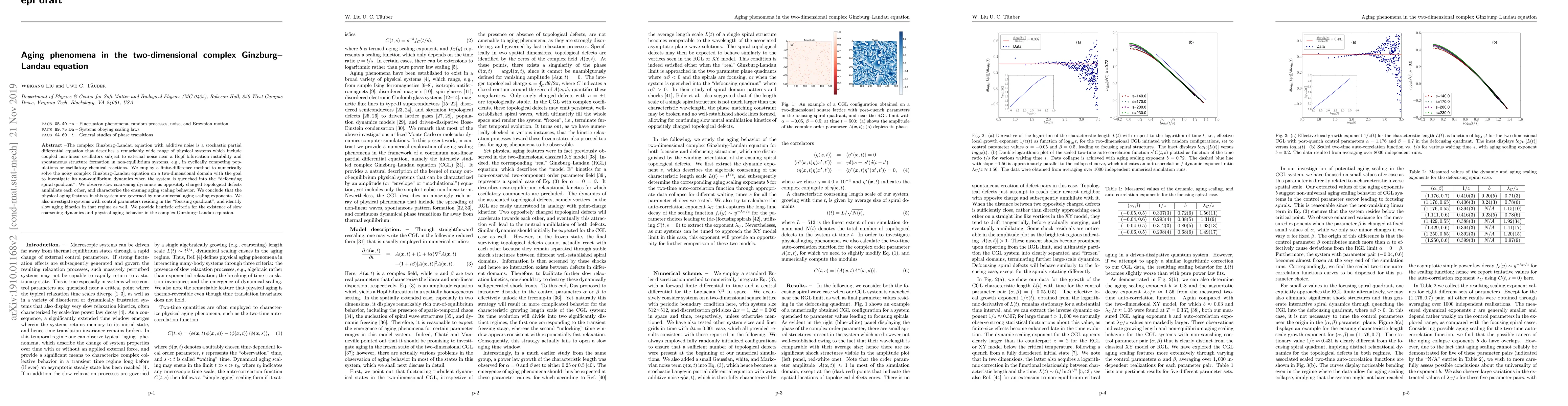 The study numerically investigates the aging phenomena in the two-dimensional complex Ginzburg-Landau equation, revealing slow coarsening dynamics and non-universal aging scaling behavior in the "defocusing spiral quadrant." Additionally, slow aging kinetics are observed in the "focusing quadrant," providing criteria for predicting such dynamics.