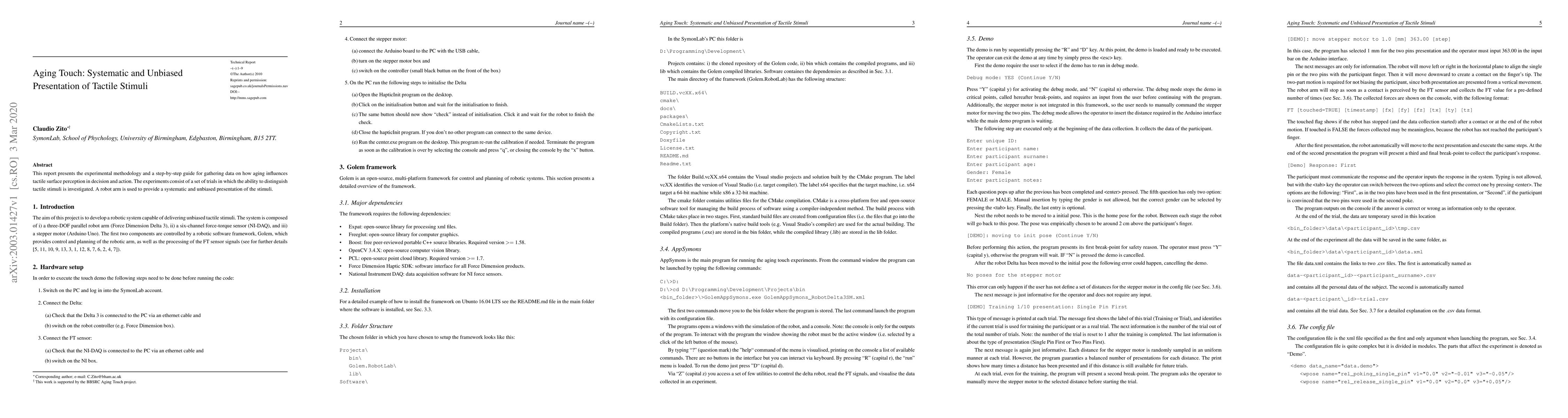 This report presents the experimental methodology and a step-by-step guide for gathering data on how aging influences tactile surface perception in decision and action. The experiments consist of a set of trials in which the ability to distinguish tactile stimuli is investigated. A robot arm is used to provide a systematic and unbiased presentation of the stimuli.