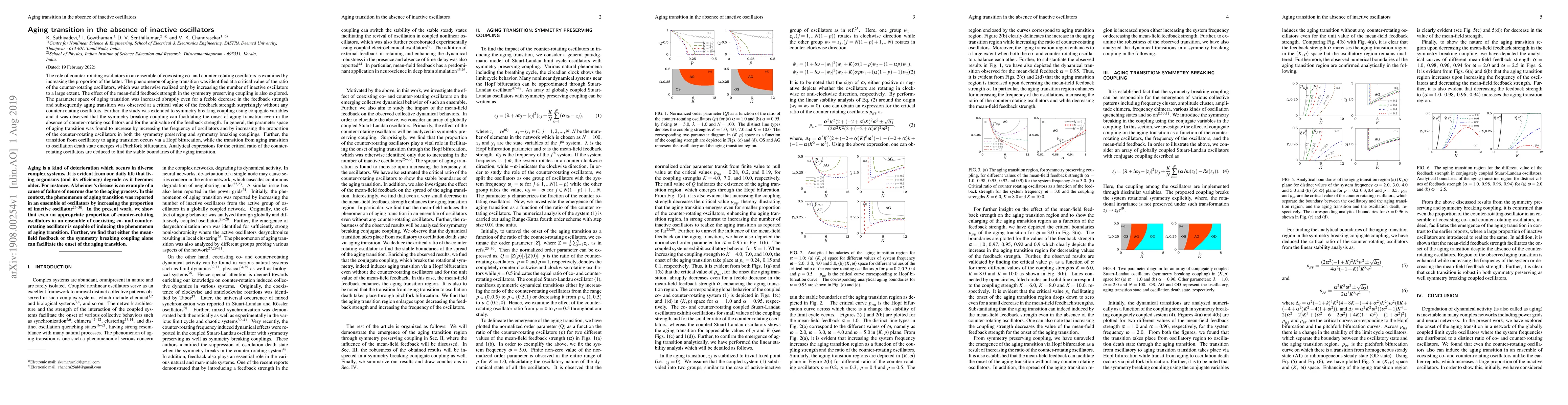 The role of counter-rotating oscillators in an ensemble of coexisting co- and counter-rotating oscillators is examined by increasing the proportion of the latter. The phenomenon of aging transition was identified at a critical value of the ratio of the counter-rotating oscillators, which was otherwise realized only by increasing the number of inactive oscillators to a large extent. The effect of the mean-field feedback strength in the symmetry preserving coupling is also explored. The parameter space of aging transition was increased abruptly even for a feeble decrease in the feedback strength and subsequently, the aging transition was observed at a critical value of the feedback strength surprisingly without any counter-rotating oscillators. Further, the study was extended to symmetry breaking coupling using conjugate variables and it was observed that the symmetry breaking coupling can facilitating the onset of aging transition even in the absence of counter-rotating oscillators and for the unit value of the feedback strength. In general, the parameter space of aging transition was found to increase by increasing the frequency of oscillators and by increasing the proportion of the counter-rotating oscillators in both the symmetry preserving and symmetry breaking couplings. Further, the transition from oscillatory to aging transition occurs via a Hopf bifurcation, while the transition from aging transition to oscillation death state emerges via Pitchfork bifurcation. Analytical expressions for the critical ratio of the counter- rotating oscillators are deduced to find the stable boundaries of the aging transition.