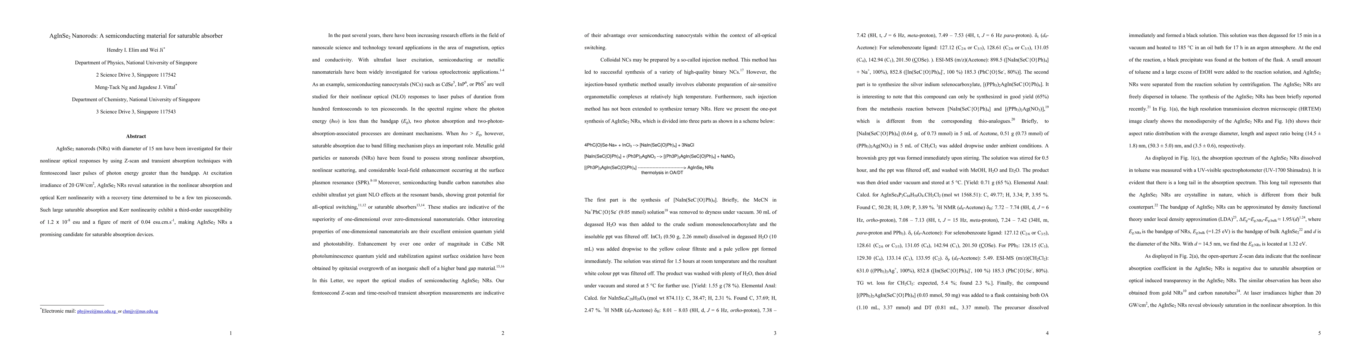 AgInSe2 nanorods demonstrate significant saturable absorption and optical Kerr nonlinearity at high excitation irradiance, making them a promising material for use in saturable absorber devices. Their large third-order susceptibility and figure of merit indicate potential for advanced optical applications.