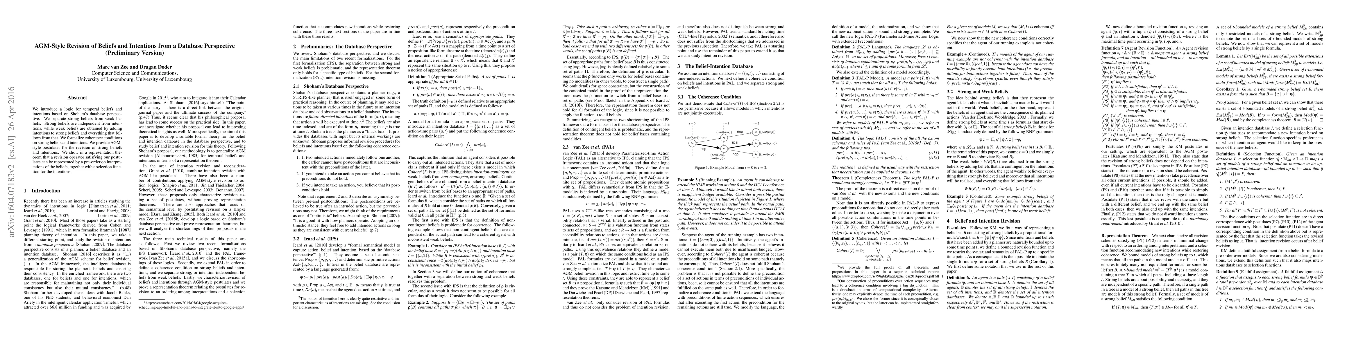We introduce a logic for temporal beliefs and intentions based on Shoham's database perspective. We separate strong beliefs from weak beliefs. Strong beliefs are independent from intentions, while weak beliefs are obtained by adding intentions to strong beliefs and everything that follows from that. We formalize coherence conditions on strong beliefs and intentions. We provide AGM-style postulates for the revision of strong beliefs and intentions. We show in a representation theorem that a revision operator satisfying our postulates can be represented by a pre-order on interpretations of the beliefs, together with a selection function for the intentions.