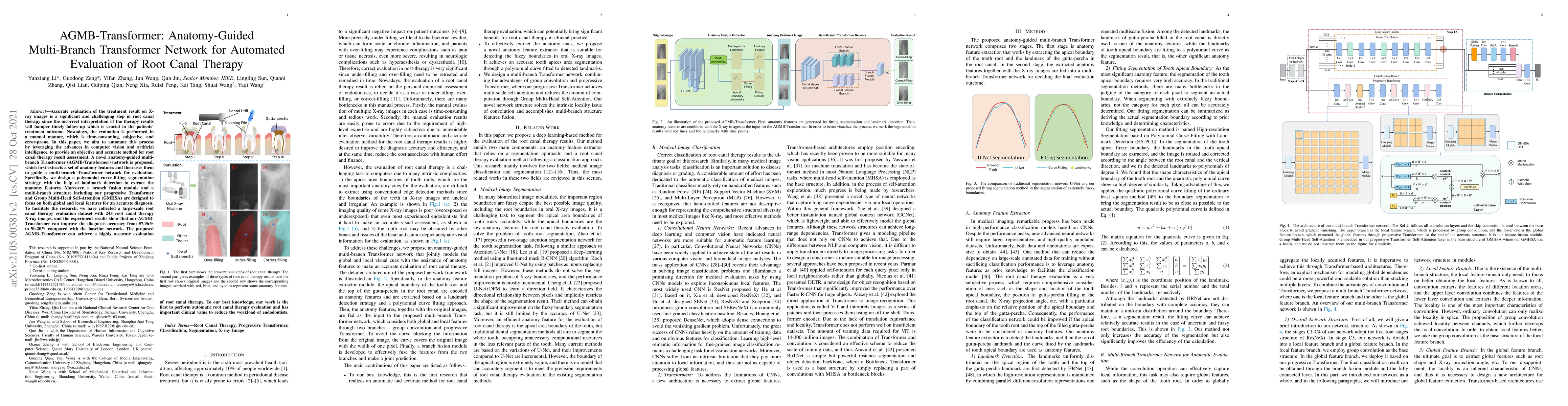 This paper proposes a new AI model called AGMB-Transformer to accurately evaluate root canal therapy results from X-ray images, improving diagnosis accuracy from 57.96% to 90.20%. The model uses anatomy features extracted using landmark detection to guide a multi-branch transformer network for more accurate evaluation.