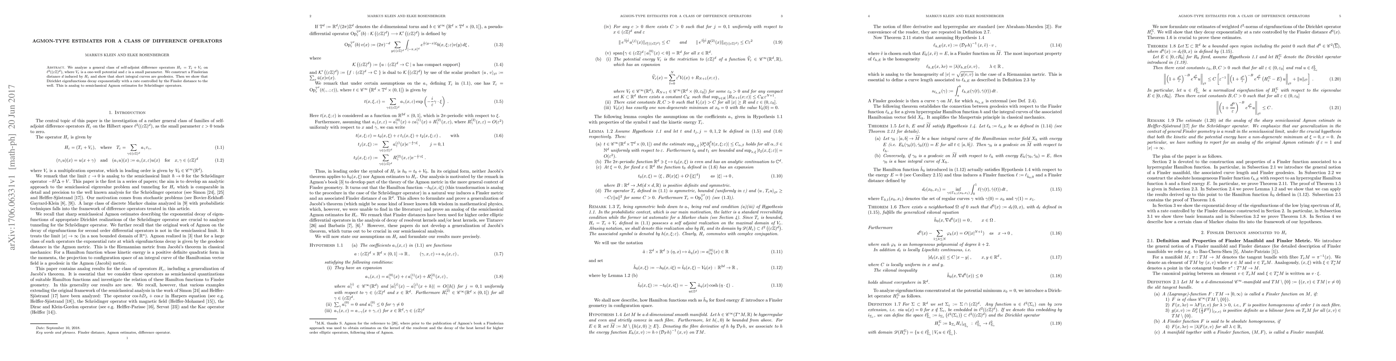 We analyze a general class of self-adjoint difference operators $H_\varepsilon = T_\varepsilon + V_\varepsilon$ on $\ell^2(\varepsilon\mathbb{Z}^d)$, where $V_\varepsilon$ is a one-well potential and $\varepsilon$ is a small parameter. We construct a Finslerian distance $d$ induced by $H_\varepsilon$ and show that short integral curves are geodesics. Then we show that Dirichlet eigenfunctions decay exponentially with a rate controlled by the Finsler distance to the well. This is analog to semiclassical Agmon estimates for Schr\"odinger operators.