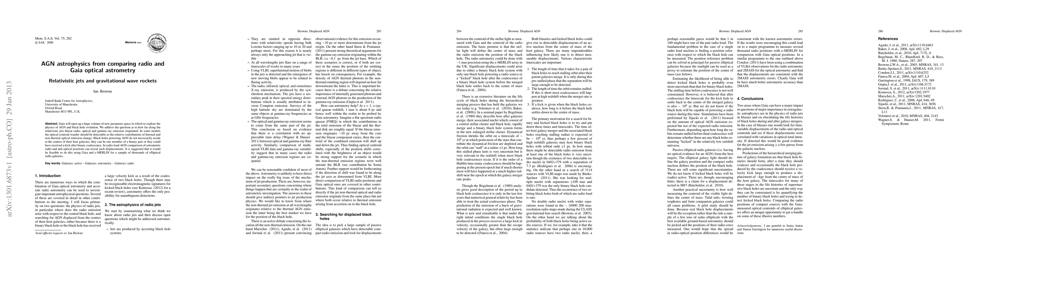 Gaia will open up a huge volume of new parameter space in which to explore the physics of AGN and black hole evolution. We address the question as to how far along the relativistic jets blazar radio, optical and gamma ray emission originated. In some models the optical centroid wander should be detectable as the relative contributions of thermal and non-thermal optical emission change. Black holes powering AGN do not necessarily reside at the centres of their host galaxies; they can be one member of a binary pair or they could have received a kick after binary coalescence. For radio-loud AGN comparison of astrometric radio and and optical positions can reveal such displacements. It is suggested that it would be feasible to do this using Gaia and e-MERLIN for a sample of thousands of elliptical radio galaxies.