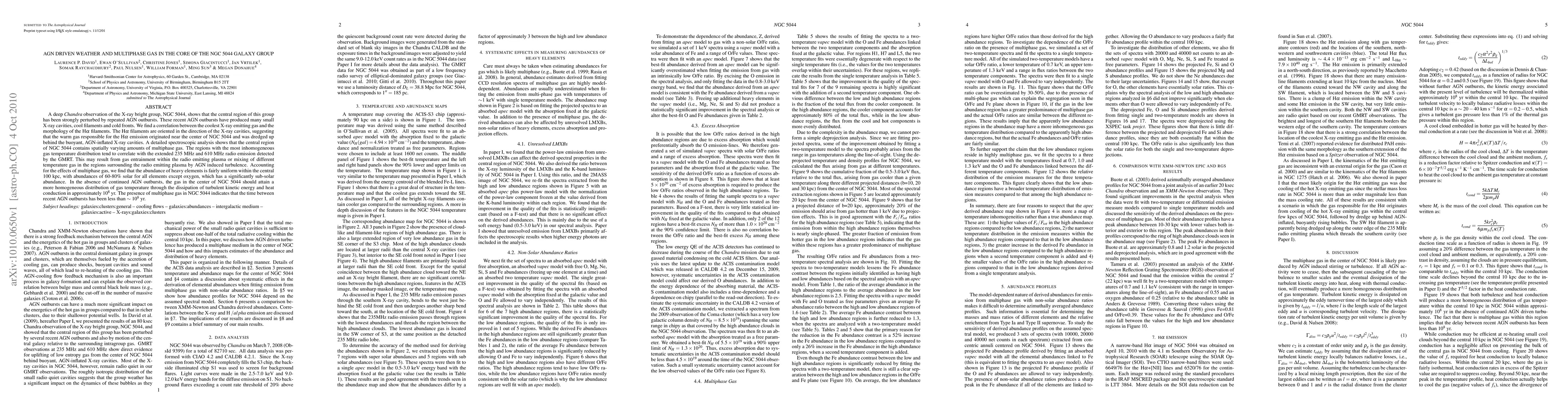 This study reveals that AGN activity in NGC 5044 has created complex multiphase gas structures, including X-ray cavities, cool filaments, and cold fronts, suggesting recent AGN outbursts. The analysis indicates a uniform heavy element abundance, except for oxygen, and predicts that without continued AGN activity, the gas will homogenize over 10^8 years.