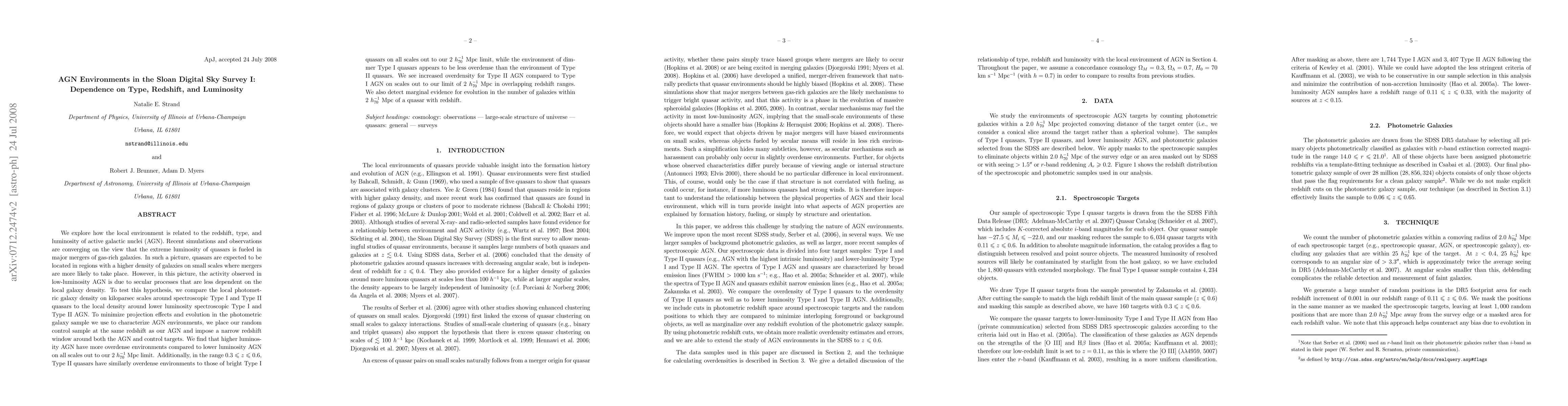 We explore how the local environment is related to the redshift, type, and luminosity of active galactic nuclei (AGN). Recent simulations and observations are converging on the view that the extreme luminosity of quasars is fueled in major mergers of gas-rich galaxies. In such a picture, quasars are expected to be located in regions with a higher density of galaxies on small scales where mergers are more likely to take place. However, in this picture, the activity observed in low-luminosity AGN is due to secular processes that are less dependent on the local galaxy density. To test this hypothesis, we compare the local photometric galaxy density on kiloparsec scales around spectroscopic Type I and Type II quasars to the local density around lower luminosity spectroscopic Type I and Type II AGN. To minimize projection effects and evolution in the photometric galaxy sample we use to characterize AGN environments, we place our random control sample at the same redshift as our AGN and impose a narrow redshift window around both the AGN and control targets. We find that higher luminosity AGN have more overdense environments compared to lower luminosity AGN on all scales out to our $2\Mpchseventy$ limit. Additionally, in the range $0.3\leqslant z\leqslant 0.6$, Type II quasars have similarly overdense environments to those of bright Type I quasars on all scales out to our $2\Mpchseventy$ limit, while the environment of dimmer Type I quasars appears to be less overdense than the environment of Type II quasars. We see increased overdensity for Type II AGN compared to Type I AGN on scales out to our limit of $2\Mpchseventy$ in overlapping redshift ranges. We also detect marginal evidence for evolution in the number of galaxies within $2\Mpchseventy$ of a quasar with redshift.