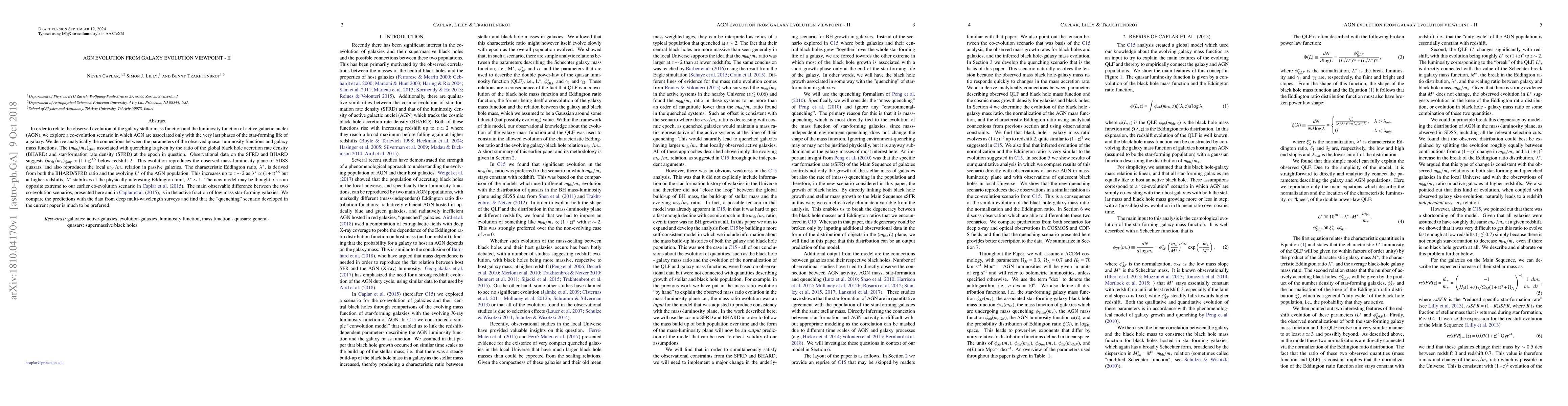 In order to relate the observed evolution of the galaxy stellar mass function and the luminosity function of active galactic nuclei (AGN), we explore a co-evolution scenario in which AGN are associated only with the very last phases of the star-forming life of a galaxy. We derive analytically the connections between the parameters of the observed quasar luminosity functions and galaxy mass functions. The $(m_{\rm bh}/m_{*})_{Qing}$ associated with quenching is given by the ratio of the global black hole accretion rate density (BHARD) and star-formation rate density (SFRD) at the epoch in question. Observational data on the SFRD and BHARD suggests $(m_{\rm bh}/m_{*})_{Qing} \propto (1+z)^{1.5}$ below redshift 2. This evolution reproduces the observed mass-luminosity plane of SDSS quasars, and also reproduces the local $m_{\rm bh}/m_{*}$ relation in passive galaxies. The characteristic Eddington ratio, $\lambda^*$, is derived from both the BHARD/SFRD ratio and the evolving $L^*$ of the AGN population. This increases up to $z \sim 2$ as $\lambda^* \propto (1+z)^{2.5}$ but at higher redshifts, $\lambda^*$ stabilizes at the physically interesting Eddington limit, $\lambda^* \sim 1$. The new model may be thought of as an opposite extreme to our earlier co-evolution scenario in Caplar et al. 2015. The main observable difference between the two co-evolution scenarios, presented here and in Caplar et al. 2015, is in the active fraction of low mass star-forming galaxies. We compare the predictions with the data from deep multi-wavelength surveys and find that the "quenching" scenario developed in the current paper is much to be preferred.