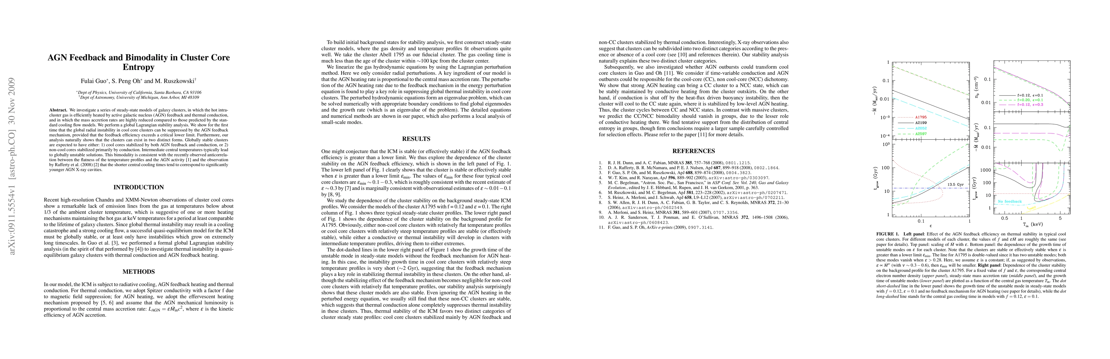 This paper explores steady-state models of galaxy clusters where AGN feedback suppresses global radial instability in cool core clusters, leading to a bimodality in cluster core entropy. The analysis reveals two distinct cluster forms: cool cores stabilized by AGN feedback and conduction, or non-cool cores primarily stabilized by conduction.