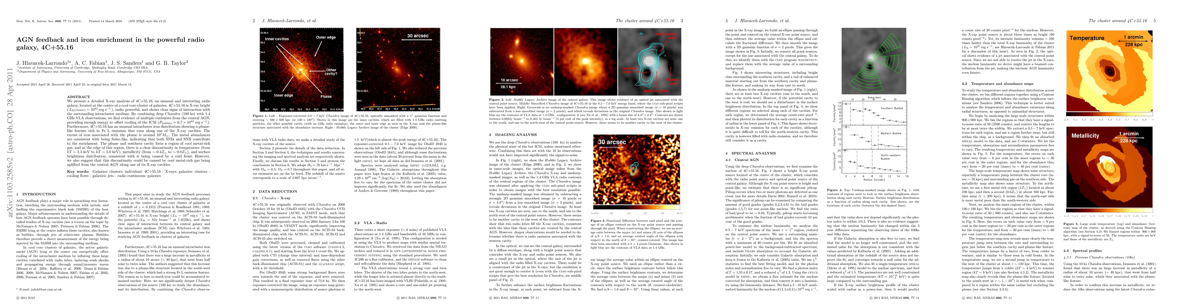 We present a detailed X-ray analysis of 4C+55.16, an unusual and interesting radio galaxy, located at the centre of a cool core cluster of galaxies. 4C+55.16 is X-ray bright (L(cluster)~10^45 erg/s), radio powerful, and shows clear signs of interaction with the surrounding intracluster medium. By combining deep Chandra (100 ks) with 1.4 GHz VLA observations, we find evidence of multiple outbursts from the central AGN, providing enough energy to offset cooling of the ICM (P_bubbles=6.7x10^44 erg/s). Furthermore, 4C+55.16 has an unusual intracluster iron distribution showing a plume-like feature rich in Fe L emission that runs along one of the X-ray cavities. The excess of iron associated with the plume is around 10^7M_sol. The metal abundances are consistent with being Solar-like, indicating that both SNIa and SNII contribute to the enrichment. The plume and southern cavity form a region of cool metal-rich gas, and at the edge of this region, there is a clear discontinuity in temperature (from kT~2.5 keV to kT~5.0 keV), metallicity (from ~0.4 solar to 0.8 solar), and surface brightness distribution, consistent with it being caused by a cold front. However, we also suggest that this discontinuity could be caused by cool metal-rich gas being uplifted from the central AGN along one of its X-ray cavities.