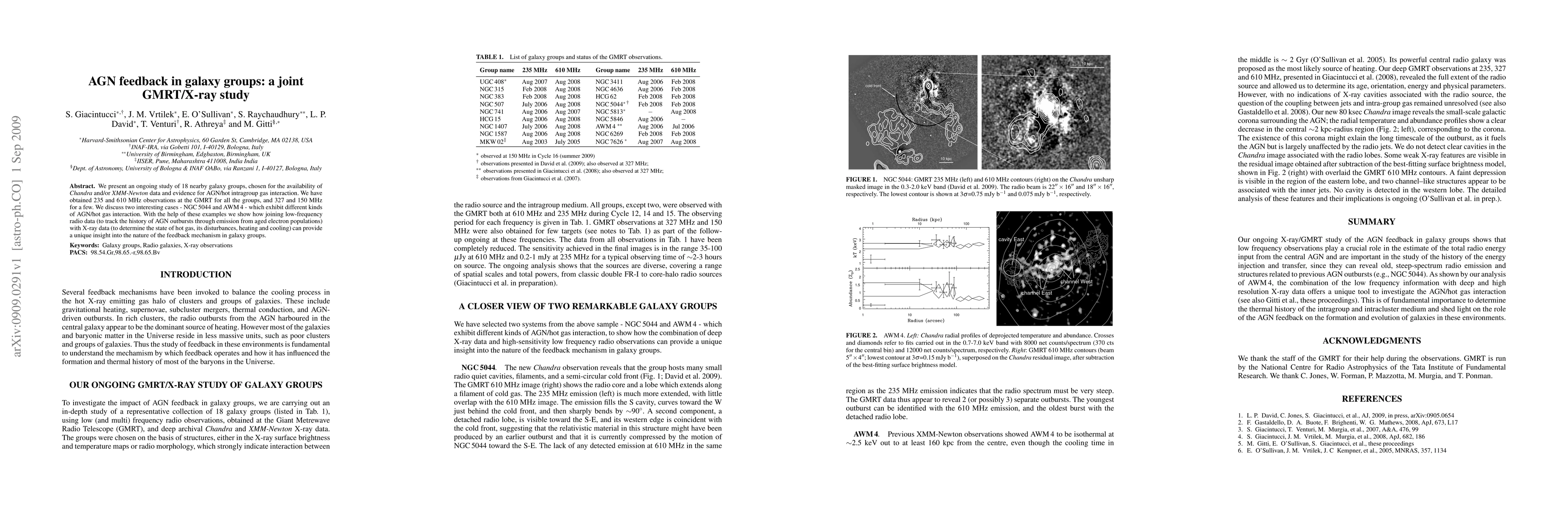 We present an ongoing study of 18 nearby galaxy groups, chosen for the availability of Chandra and/or XMM-Newton data and evidence for AGN/hot intragroup gas interaction. We have obtained 235 and 610 MHz observations at the GMRT for all the groups, and 327 and 150 MHz for a few. We discuss two interesting cases - NGC 5044 and AWM 4 - which exhibit different kinds of AGN/hot gas interaction. With the help of these examples we show how joining low-frequency radio data (to track the history of AGN outbursts through emission from aged electron populations) with X-ray data (to determine the state of hot gas, its disturbances, heating and cooling) can provide a unique insight into the nature of the feedback mechanism in galaxy groups.