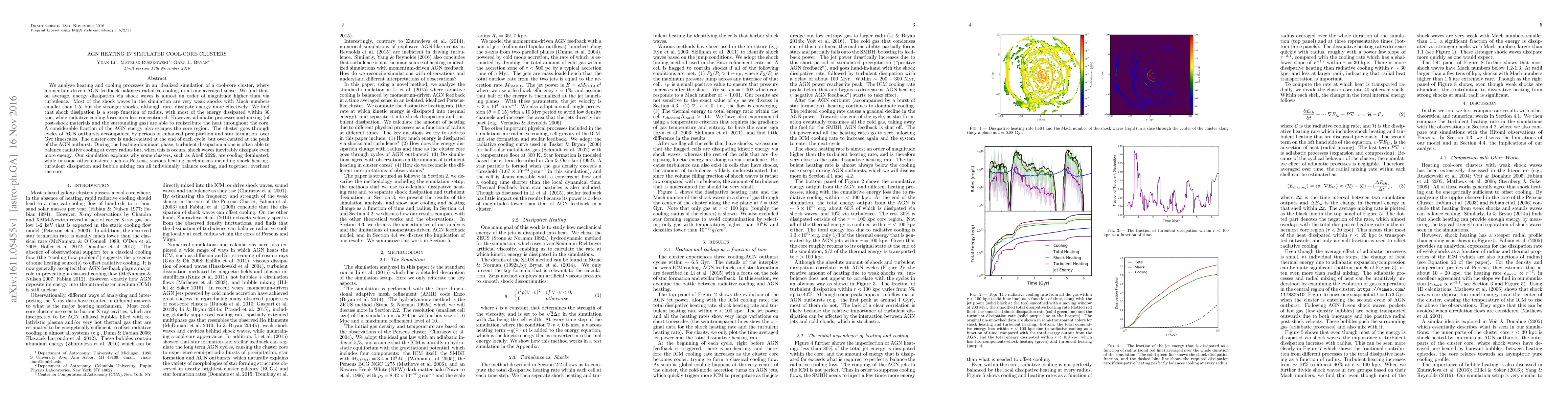 This paper examines AGN heating mechanisms in cool-core clusters, finding that shock waves dissipate significantly more energy than turbulence. Shock dissipation is concentrated within 30 kpc, while radiative cooling is more widespread, but mixing redistributes heat throughout the core.