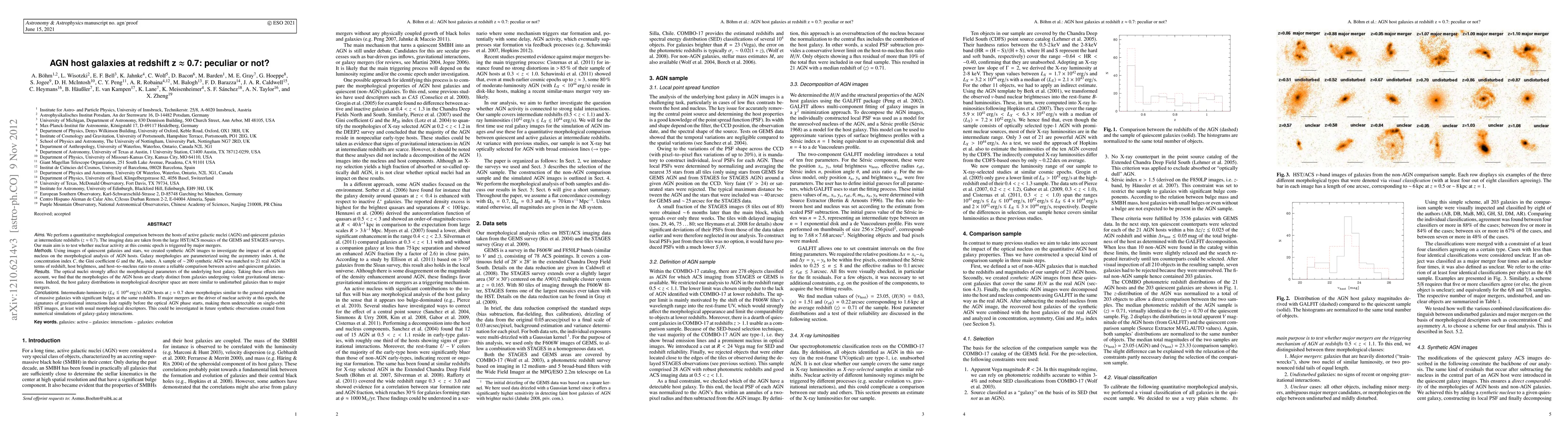 We perform a quantitative morphological comparison between the hosts of Active Galactic Nuclei (AGN) and quiescent galaxies at intermediate redshifts (z~0.7). The imaging data are taken from the large HST/ACS mosaics of the GEMS and STAGES surveys. Our main aim is to test whether nuclear activity at this cosmic epoch is triggered by major mergers. Using images of quiescent galaxies and stars, we create synthetic AGN images to investigate the impact of an optical nucleus on the morphological analysis of AGN hosts. Galaxy morphologies are parameterized using the asymmetry index A, concentration index C, Gini coefficient G and M20 index. A sample of ~200 synthetic AGN is matched to 21 real AGN in terms of redshift, host brightness and host-to-nucleus ratio to ensure a reliable comparison between active and quiescent galaxies. The optical nuclei strongly affect the morphological parameters of the underlying host galaxy. Taking these effects into account, we find that the morphologies of the AGN hosts are clearly distinct from galaxies undergoing violent gravitational interactions. In fact, the host galaxies' distributions in morphological descriptor space are more similar to undisturbed galaxies than major mergers. Intermediate-luminosity (Lx < 10^44 erg/s) AGN hosts at z~0.7 show morphologies similar to the general population of massive galaxies with significant bulges at the same redshifts. If major mergers are the driver of nuclear activity at this epoch, the signatures of gravitational interactions fade rapidly before the optical AGN phase starts, making them undetectable on single-orbit HST images, at least with usual morphological descriptors. This could be investigated in future synthetic observations created from numerical simulations of galaxy-galaxy interactions.