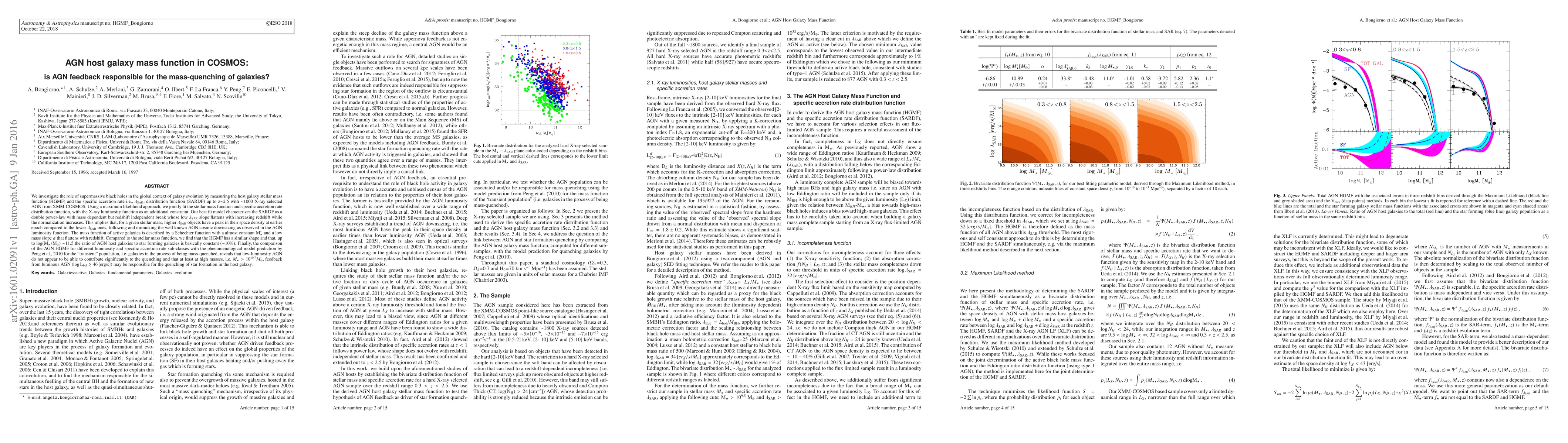 We investigate the role of supermassive black holes in the global context of galaxy evolution by measuring the host galaxy stellar mass function (HGMF) and the specific accretion rate i.e., lambda_SAR, distribution function (SARDF) up to z~2.5 with ~1000 X-ray selected AGN from XMM-COSMOS. Using a maximum likelihood approach, we jointly fit the stellar mass function and specific accretion rate distribution function, with the X-ray luminosity function as an additional constraint. Our best fit model characterizes the SARDF as a double power-law with mass dependent but redshift independent break whose low lambda_SAR slope flattens with increasing redshift while the normalization increases. This implies that, for a given stellar mass, higher lambda_SAR objects have a peak in their space density at earlier epoch compared to the lower lambda_SAR ones, following and mimicking the well known AGN cosmic downsizing as observed in the AGN luminosity function. The mass function of active galaxies is described by a Schechter function with a almost constant Mstar* and a low mass slope alpha that flattens with redshift. Compared to the stellar mass function, we find that the HGMF has a similar shape and that, up to log((Mstar/Msun)~11.5 the ratio of AGN host galaxies to star forming galaxies is basically constant (~10%). Finally, the comparison of the AGN HGMF for different luminosity and specific accretion rate sub-classes with the phenomenological model prediction by Peng et al. (2010) for the "transient" population, i.e. galaxies in the process of being mass-quenched, reveals that low-luminosity AGN do not appear to be able to contribute significantly to the quenching and that at least at high masses, i.e. Mstar>10^(10.7) Msun , feedback from luminous AGN (log(Lbol)>~46 [erg/s]) may be responsible for the quenching of star formation in the host galaxy.