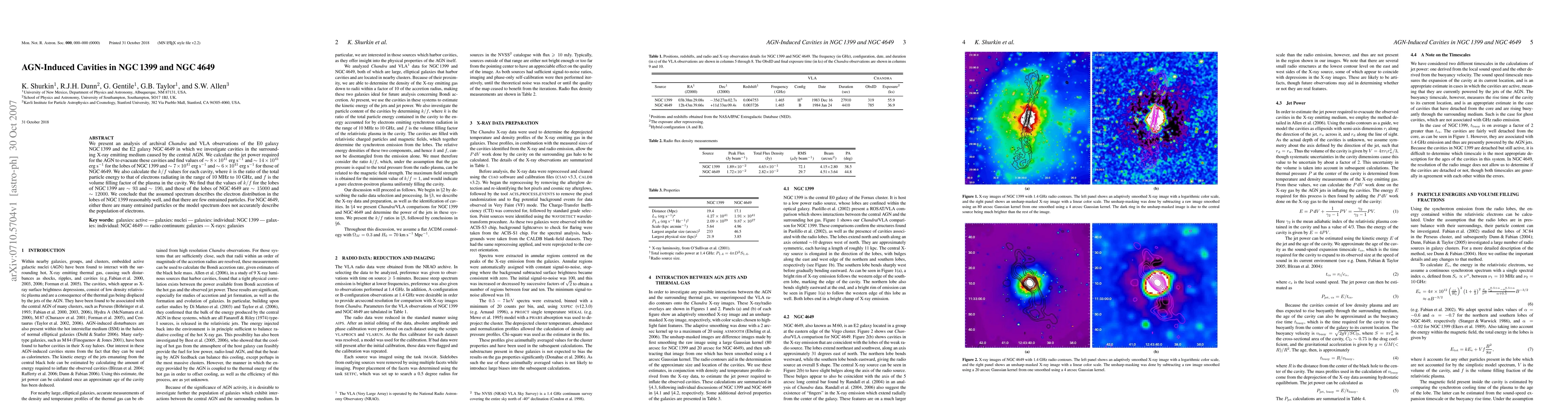This study analyzes Chandra and VLA data to investigate AGN-induced cavities in NGC 1399 and NGC 4649, finding that the required jet powers for cavity evacuation are around 8x10^{41} erg/s for NGC 1399 and 7x10^{41} erg/s for NGC 4649. The k/f values suggest a good fit for the electron distribution in NGC 1399's cavities, while NGC 4649 may have many entrained particles or a poorly fitting model spectrum.