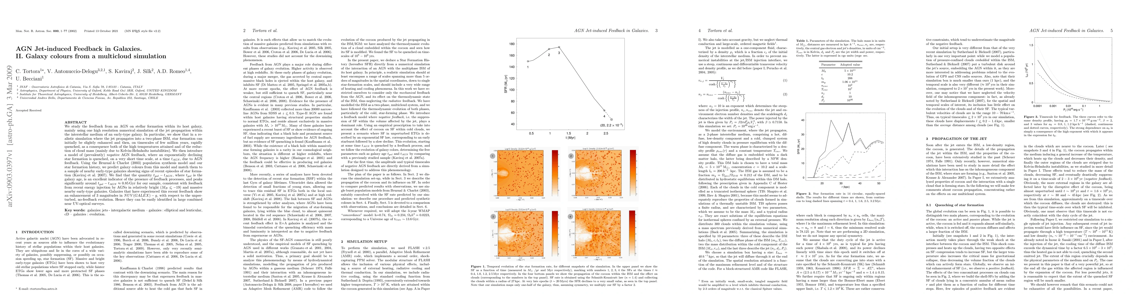 We study the feedback from an AGN on stellar formation within its host galaxy, mainly using one high resolution numerical simulation of the jet propagation within the interstellar medium of an early-type galaxy. In particular, we show that in a realistic simulation where the jet propagates into a two-phase ISM, star formation can initially be slightly enhanced and then, on timescales of few million years, rapidly quenched, as a consequence both of the high temperatures attained and of the reduction of cloud mass (mainly due to Kelvin-Helmholtz instabilities). We then introduce a model of (prevalently) {\em negative} AGN feedback, where an exponentially declining star formation is quenched, on a very short time scale, at a time t_AGN, due to AGN feedback. Using the Bruzual & Charlot (2003) population synthesis model and our star formation history, we predict galaxy colours from this model and match them to a sample of nearby early-type galaxies showing signs of recent episodes of star formation (Kaviraj et al. 2007). We find that the quantity t_gal - t_AGN, where t_gal is the galaxy age, is an excellent indicator of the presence of feedback processes, and peaks significantly around t_gal - t_AGN \approx 0.85 Gyr for our sample, consistent with feedback from recent energy injection by AGNs in relatively bright (M_{B} \lsim -19) and massive nearby early-type galaxies. Galaxies that have experienced this recent feedback show an enhancement of 3 magnitudes in NUV(GALEX)-g, with respect to the unperturbed, no-feedback evolution. Hence they can be easily identified in large combined near UV-optical surveys.