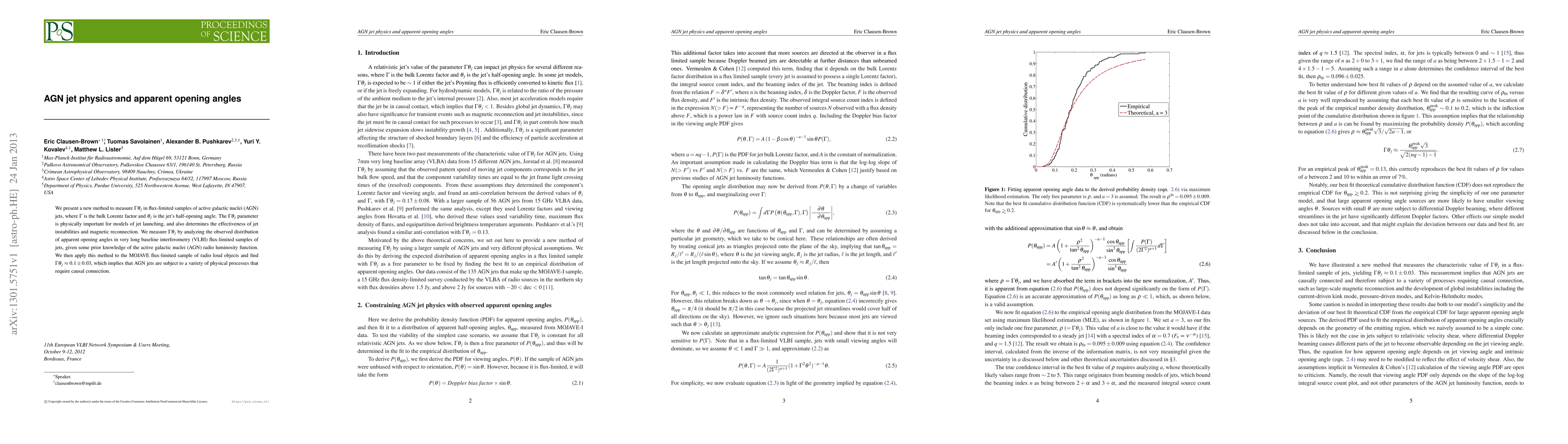 This paper introduces a new method to determine the Gamma*theta_j parameter in AGN jets, crucial for understanding jet launching and instabilities. The method analyzes apparent opening angles in VLBI flux-limited samples, yielding Gamma*theta_j = 0.1 ± 0.03 for the MOJAVE sample, indicating diverse physical processes in AGN jets.