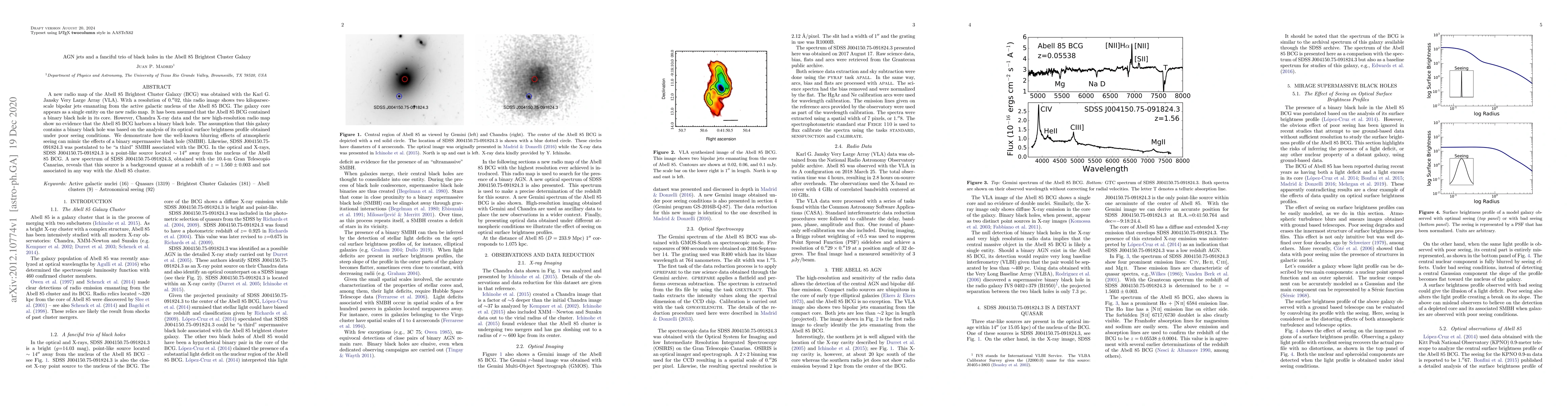 A new radio map of the Abell 85 Brightest Cluster Galaxy (BCG) was obtained with the Karl G. Jansky Very Large Array (VLA). With a resolution of 0.02", this radio image shows two kiloparsec-scale bipolar jets emanating from the active galactic nucleus of the Abell 85 BCG. The galaxy core appears as a single entity on the new radio map. It has been assumed that the Abell 85 BCG contained a binary black hole in its core. However, Chandra X-ray data and the new high-resolution radio map show no evidence that the Abell 85 BCG harbors a binary black hole. The assumption that this galaxy contains a binary black hole was based on the analysis of its optical surface brightness profile obtained under poor seeing conditions. We demonstrate how the well-known blurring effects of atmospheric seeing can mimic the effects of a binary supermassive black hole (SMBH). Likewise, SDSS J004150.75-091824.3 was postulated to be "a third" SMBH associated with the BCG. In the optical and X-rays, SDSS J004150.75-091824.3 is a point-like source located ~14" away from the nucleus of the Abell 85 BCG. A new spectrum of SDSS J004150.75-091824.3, obtained with the 10.4-m Gran Telescopio Canarias, reveals that this source is a background quasar at a redshift of z=1.560+/-0.003 and not associated in any way with the Abell 85 cluster.