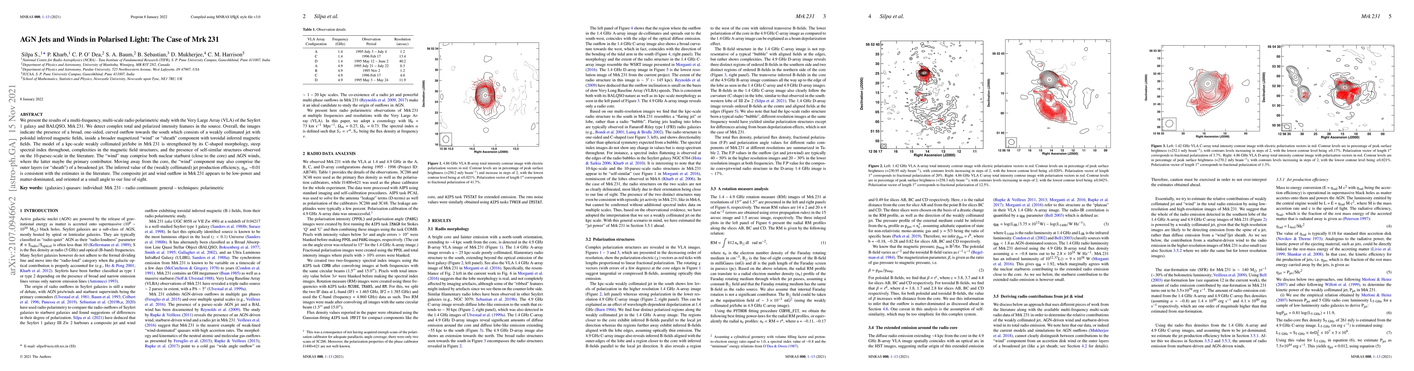 Researchers study the Seyfert 1 galaxy Mrk 231 using radio polarimetry, detecting a complex outflow with a weakly collimated jet and a broader magnetized wind component, suggesting a low-power, matter-dominated AGN.