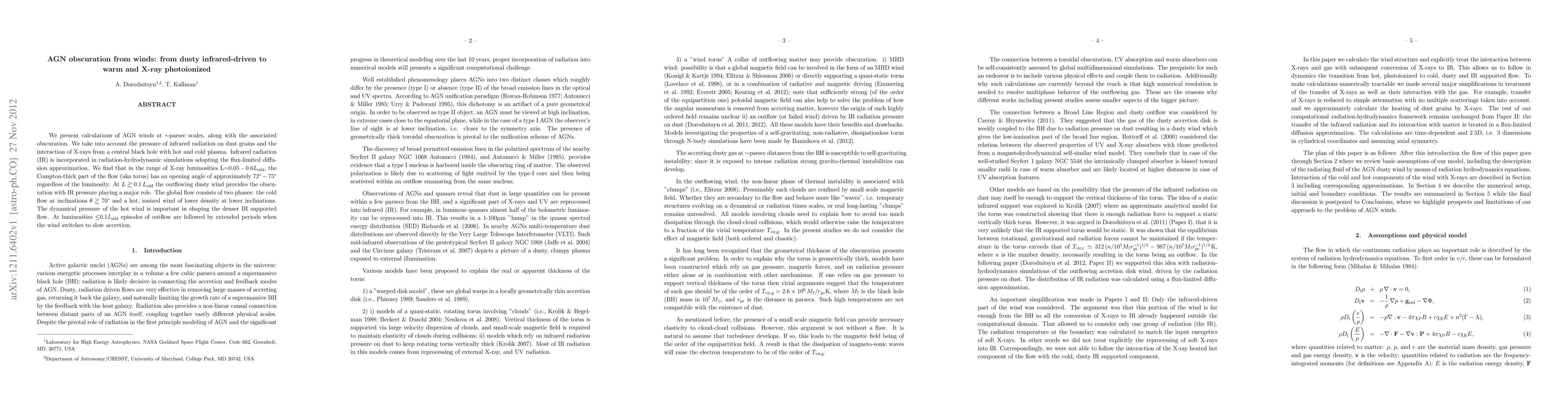 We present calculations of AGN winds at ~parsec scales, along with the associated obscuration. We take into account the pressure of infrared radiation on dust grains and the interaction of X-rays from a central black hole with hot and cold plasma. Infrared radiation (IR) is incorporated in radiation-hydrodynamic simulations adopting the flux-limited diffusion approximation. We find that in the range of X-ray luminosities L=0.05 - 0.6 L_edd, the Compton-thick part of the flow (aka torus) has an opening angle of approximately 72-75 degrees regardless of the luminosity. At L > 0.1 L_edd the outflowing dusty wind provides the obscuration with IR pressure playing a major role. The global flow consists of two phases: the cold flow at inclinations \theta > 70 degrees and a hot, ionized wind of lower density at lower inclinations. The dynamical pressure of the hot wind is important in shaping the denser IR supported flow. At luminosities <0.1 L_edd episodes of outflow are followed by extended periods when the wind switches to slow accretion.