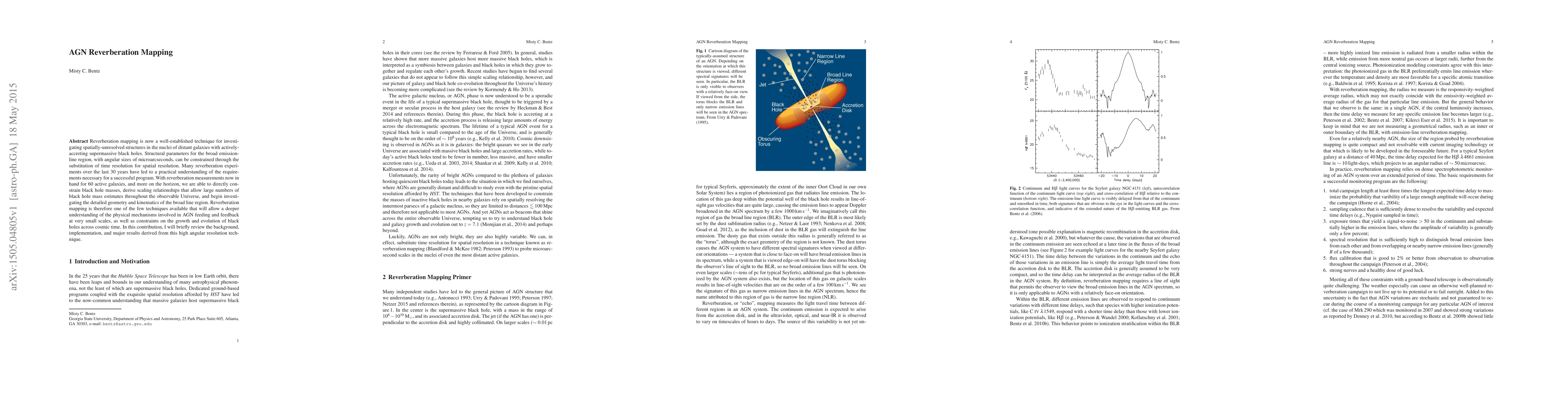 Reverberation mapping is a technique used to study the broad emission-line regions in active galactic nuclei (AGN) by measuring time delays between light variations, allowing for the determination of black hole masses and the geometry of AGN structures. This method has provided insights into the growth and evolution of black holes and the mechanisms of AGN feeding and feedback.