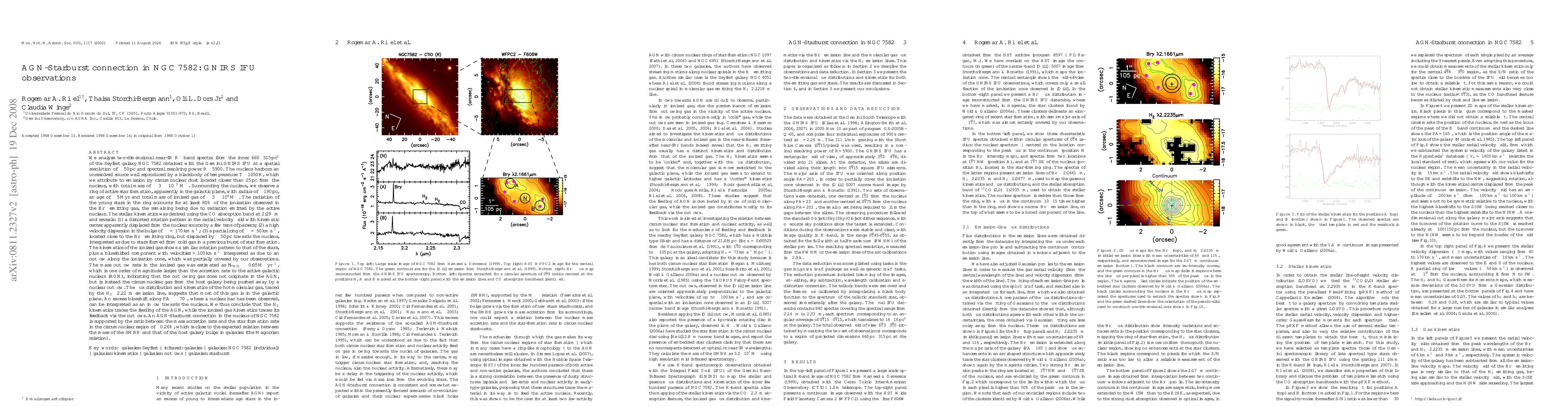 We analyse two-dimensional near-IR K-band spectra from the inner 660x315 pc^2 of the Seyfert galaxy NGC7582 obtained with the Gemini GNIRS IFU. The nucleus harbors an unresolved source well reproduced by a blackbody of temperature T 1050 K, which we attribute to emission by circumnuclear dust located closer than 25 pc from the nucleus, with total mass of ~3x10^{-3}M_Sun. Surrounding the nucleus, we observe a ring of active star formation with radius of ~190 pc, an age of ~5 Myr. The radiation of the young stars in the ring accounts for at least 80 % of the ionization observed in the Brgamma emitting gas, the remaining being due to radiation emitted by the active nucleus. The stellar kinematics reveals: (1) a distorted rotation pattern in the radial velocity field with kinematic center apparently displaced from the nuclear source by a few tens of parsecs; (2) a high velocity dispersion in the bulge of sigma=170 km/s; (3) a partial ring of sigma=50 km/s interpreted as due to stars formed from cold gas in a previous burst of star formation. The kinematics of the ionized gas shows an additional blueshifted component with velocities > 100 km/s interpreted as due to an outflow along the ionization cone. The mass outflow rate in the ionized gas was estimated as ~0.05 M_Sun/yr, which is one order of magnitude larger than the accretion rate to the AGN. The flux distribution and kinematics of the hot molecular gas, traced by the H2l2.22um emission line, suggests that most of this gas is in the galactic plane. An excess blueshift along PA~-70 can be interpreted as an inflow towards the nucleus. An AGN-Starburst connection in the nucleus of NGC7582 is supported by the ratio between the mass accretion rate and the star formation rate in the circumnuclear region of ~0.26%, which is close to the Magorrian relation.