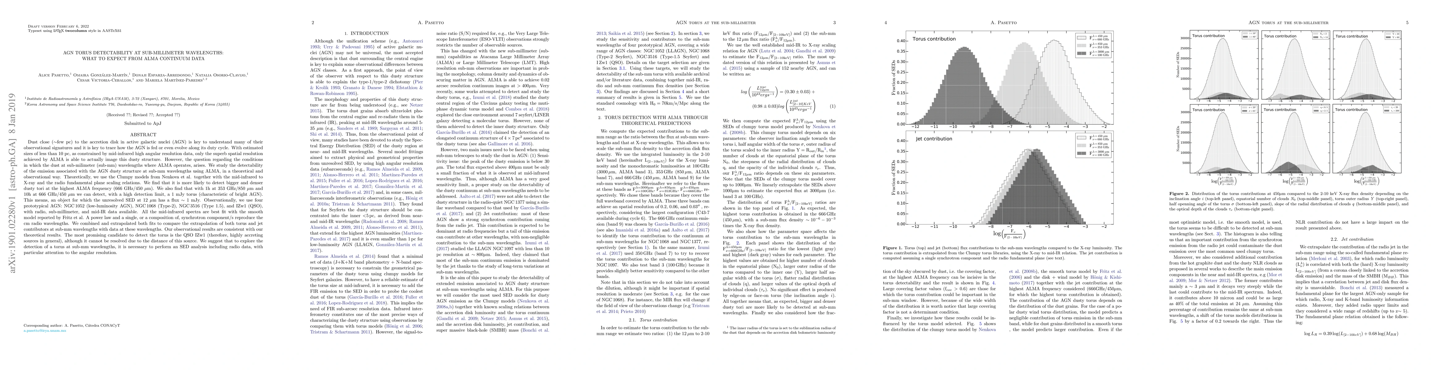 We study the detectability of the emission associated with the AGN dusty structure at sub-mm wavelengths using ALMA, in a theoretical and observational way. Theoretically, we use the Clumpy models from Nenkova et al. together with the mid-infrared to X-ray and the radio fundamental plane scaling relations. We find that it is more likely to detect bigger and denser dusty tori at the highest ALMA frequency (666 GHz/450 micron). We also find that with 1h at 353 GHz/850 micron and 10h at 666 GHz/450 micron we can detect, with a high detection limit, a 1 mJy torus (characteristic of bright AGN). This means, an object for which the unresolved SED at 12 micron has a flux ~1mJy. Observationally, we use four prototypical AGN: NGC\,1052 (low-luminosity AGN), NGC\,1068 (Type-2), NGC\,3516 (Type 1.5), and IZw1 (QSO), with radio, sub-millimeter, and mid-IR data available. All the mid-infrared spectra are best fit with the smooth model reported by Fritz et al. A power law and a single, or a composition of, synchrotron component/s reproduce the cm radio wavelengths. We combined and extrapolated both fits to compare the extrapolation of both torus and jet contributors at sub-mm wavelengths with data at these wavelengths. Our observational results are consistent with our theoretical results. The most promising candidate to detect the torus is the QSO IZw1 (therefore, highly accreting sources in general), although it cannot be resolved due to the distance of this source. We suggest that to explore the detection of a torus at sub-mm wavelengths, it is necessary to perform an SED analysis including radio data, with particular attention to the angular resolution.