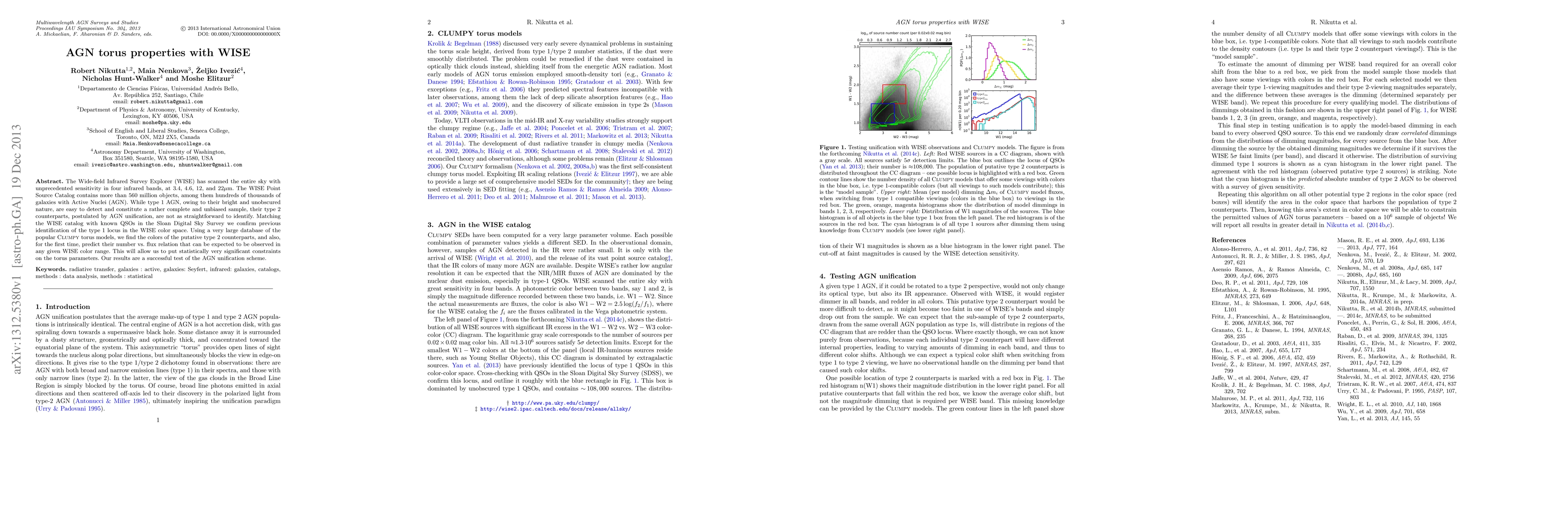 The WISE survey identifies type 1 AGN in infrared bands and matches them with SDSS QSOs, confirming the type 1 locus. It also predicts the number and flux relation of type 2 AGN counterparts, providing significant constraints on torus parameters and supporting the AGN unification model.