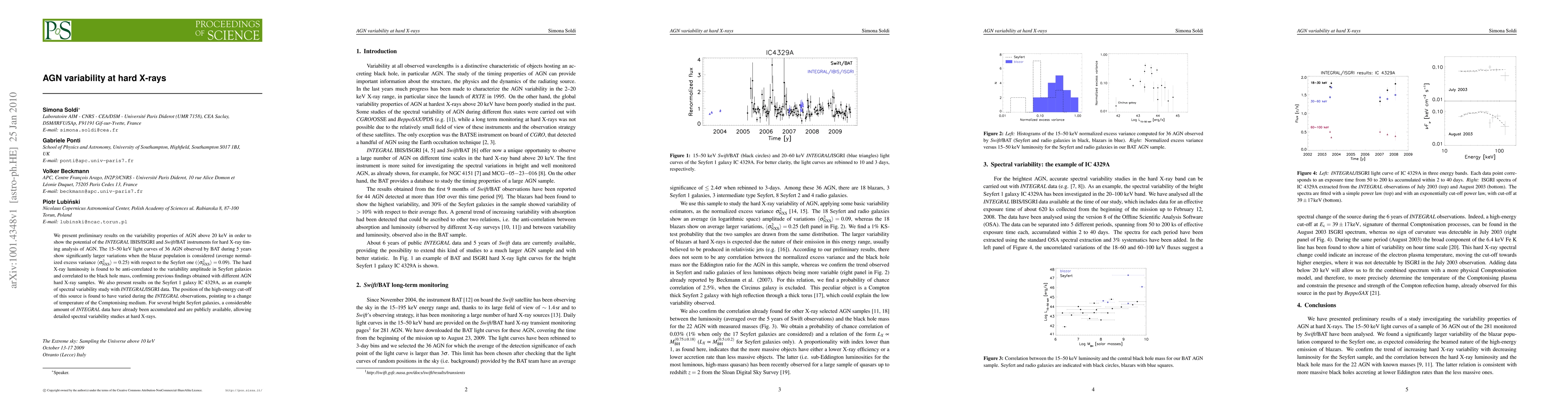 This paper investigates the variability of AGN at hard X-rays, revealing significant differences between blazars and Seyfert galaxies. The study finds that blazars exhibit higher variability compared to Seyferts, and hard X-ray luminosity inversely correlates with variability in Seyfert galaxies, while being correlated with black hole mass.