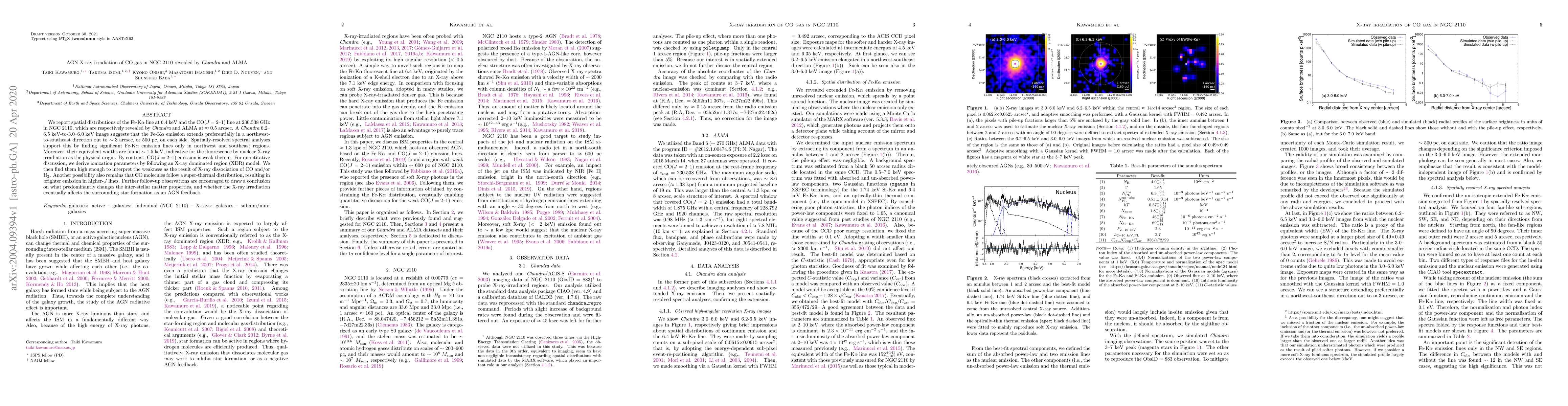 This study reveals the Fe-K$\alpha$ line and CO($J$ = 2--1) line distributions in NGC 2110 using $Chandra$ and ALMA, respectively. The Fe-K$\alpha$ emission is strong in northwest and southeast regions, suggesting fluorescence from AGN X-ray irradiation, while CO emission is weak, likely due to X-ray dissociation.