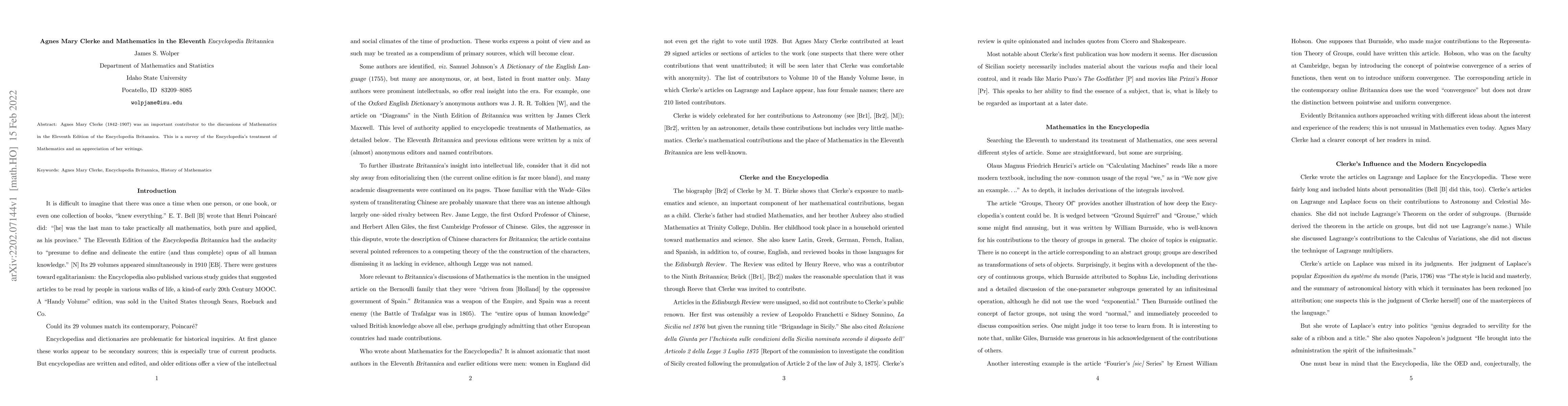 Agnes Mary Clerke significantly contributed to the Mathematics section of the Eleventh Edition of the Encyclopedia Britannica, which aimed to encapsulate all human knowledge. This paper appreciates her writings and examines the Encyclopedia's comprehensive treatment of Mathematics.