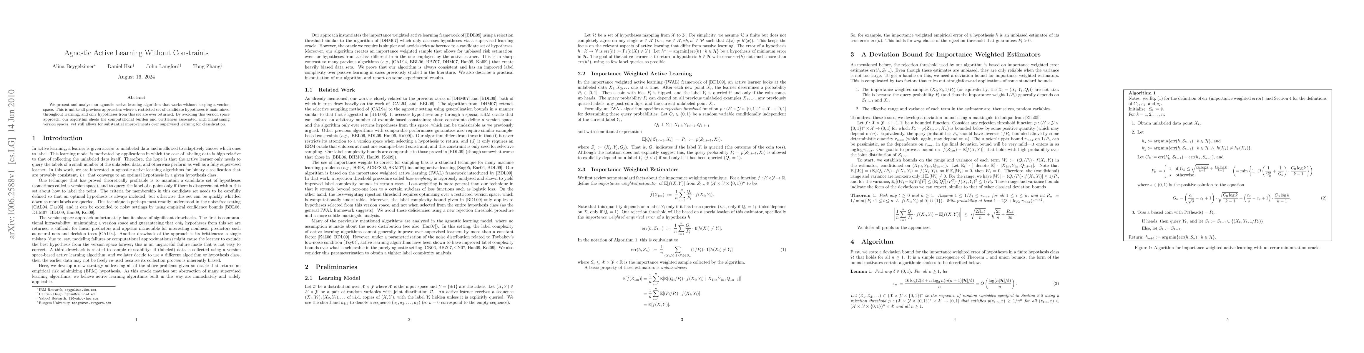 This paper introduces an agnostic active learning algorithm that does not maintain a version space, unlike previous methods, thus avoiding computational burdens and brittleness. It achieves significant classification improvements over supervised learning without relying on a restricted set of hypotheses.