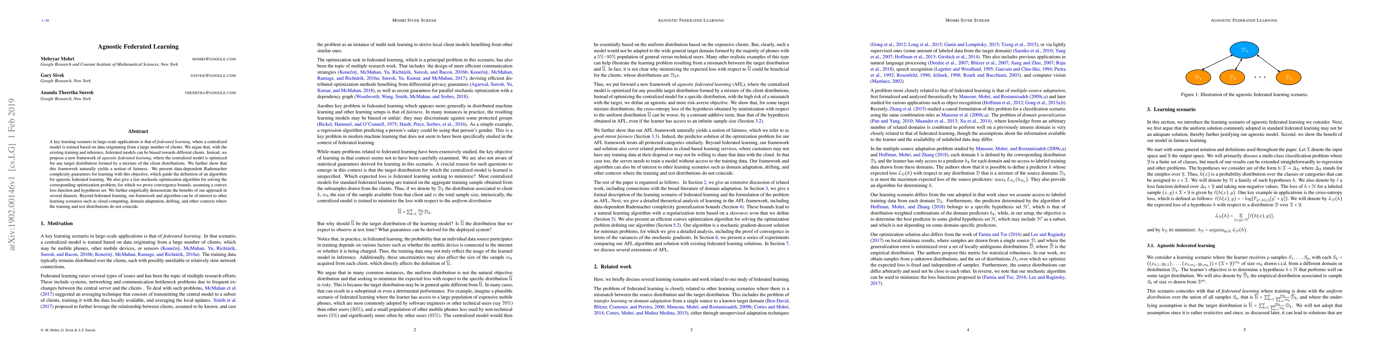 This paper proposes agnostic federated learning to address biases in federated models by optimizing for any target distribution formed by a mixture of client distributions, offering fairness and convergence guarantees. The authors provide a fast stochastic optimization algorithm and demonstrate its effectiveness across various datasets.