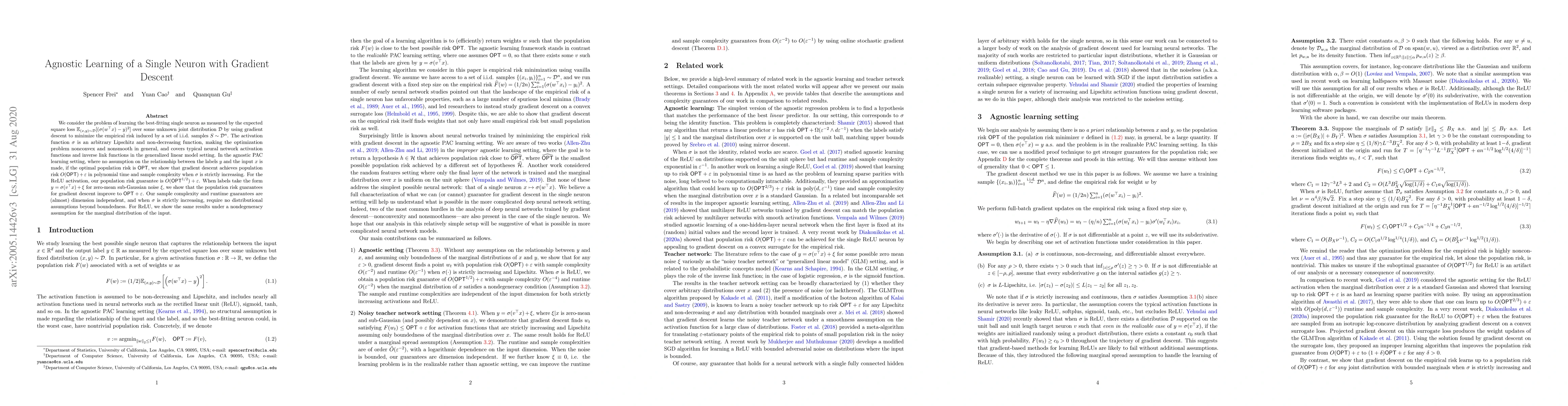 This paper investigates the agnostic learning of a single neuron using gradient descent, focusing on minimizing the expected square loss without assumptions about the relationship between input and output. It demonstrates that gradient descent can achieve near-optimal population risk in polynomial time, with improved guarantees for ReLU activation under certain conditions, including noise and nondegeneracy assumptions.