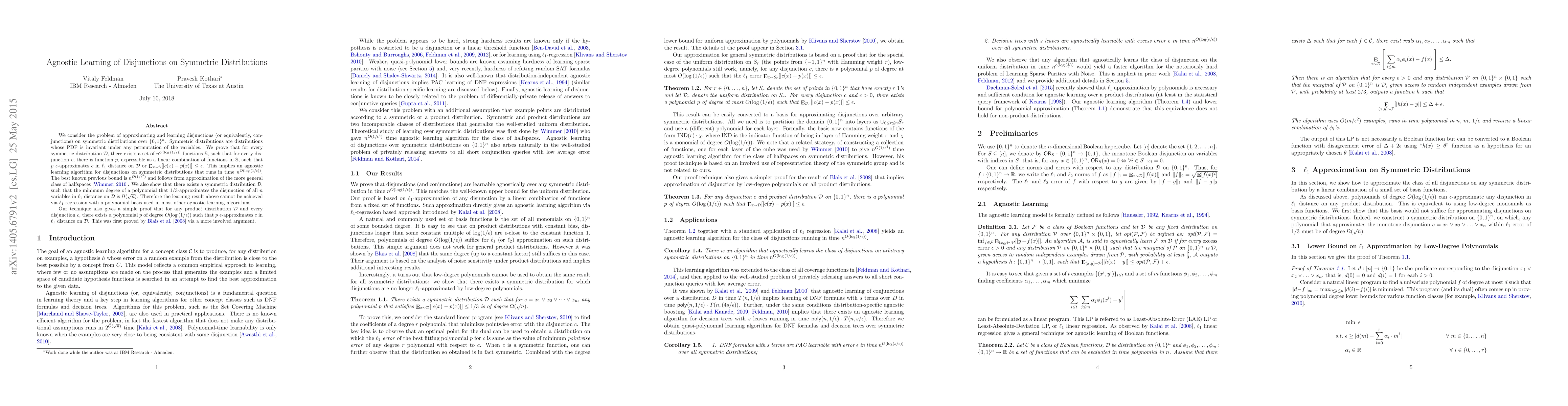 Researchers develop an agnostic learning algorithm for approximating disjunctions on symmetric distributions, achieving a time complexity of $n^{O( ext{log}(1/ ext{π}))}$.