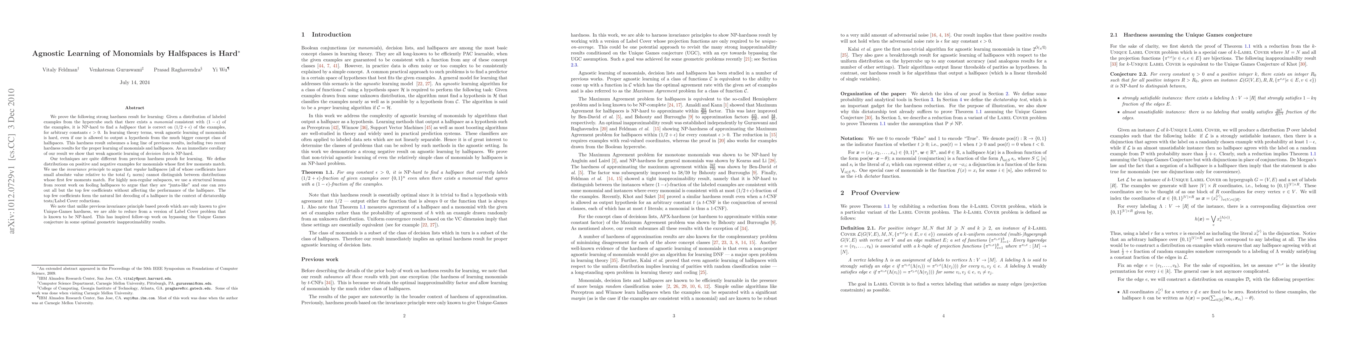 This paper proves that it is NP-hard to agnostically learn monomials using halfspaces, even when allowed to output a halfspace. The techniques involve constructing matching distributions and leveraging the invariance principle to show halfspaces cannot distinguish between them, highlighting the difficulty of weak agnostic learning.