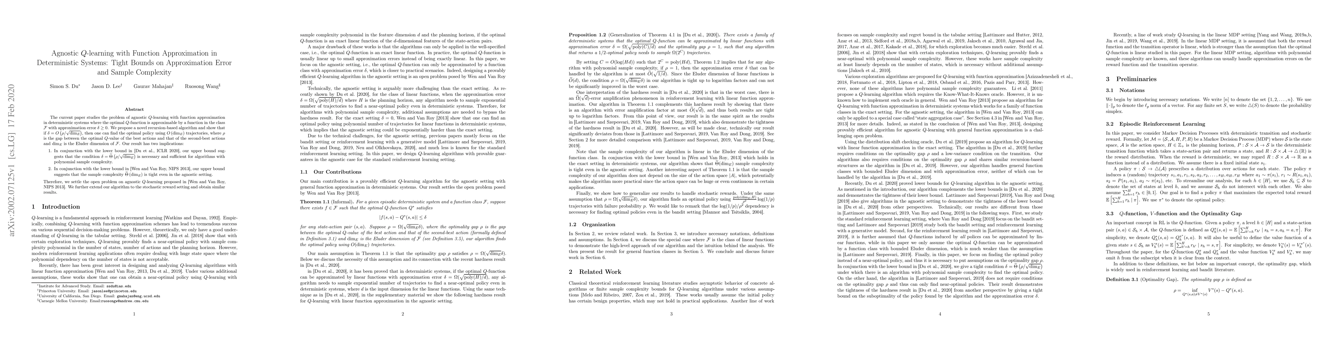 This research paper introduces a novel recursion-based agnostic Q-learning algorithm for deterministic systems, with function approximation. It demonstrates that with approximation error δ = O(ρ/√dim_E), the optimal policy can be found using O(dim_E) trajectories, where ρ is the Q-value gap and dim_E is the Eluder dimension. The findings suggest that the condition δ = Θ(ρ/√dim_E) is necessary and sufficient for polynomial sample complexity, settling an open problem in agnostic Q-learning. The method is also extended to stochastic reward settings with similar results.