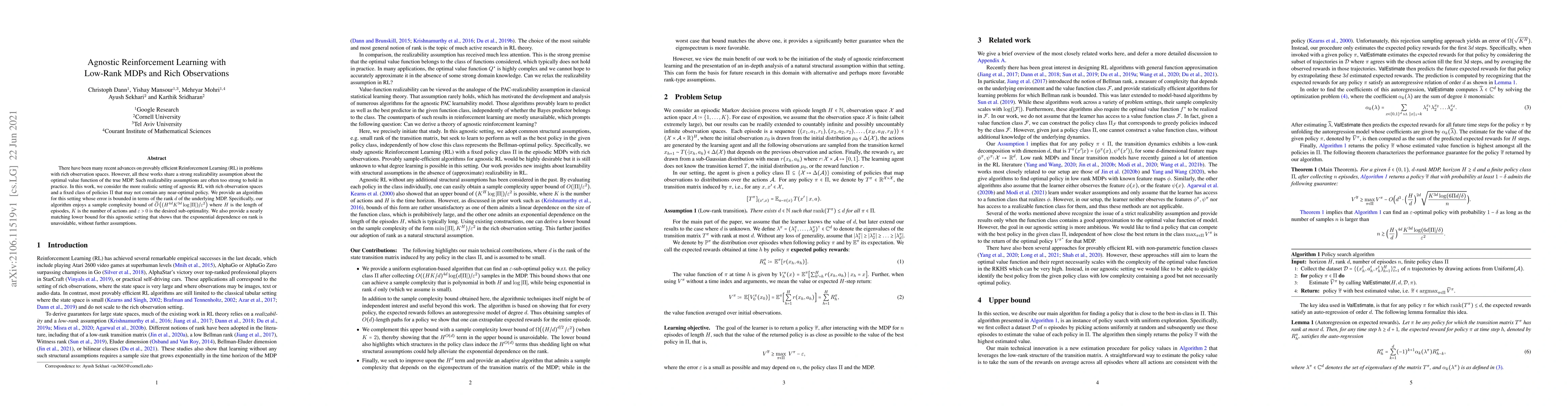 There have been many recent advances on provably efficient Reinforcement Learning (RL) in problems with rich observation spaces. However, all these works share a strong realizability assumption about the optimal value function of the true MDP. Such realizability assumptions are often too strong to hold in practice. In this work, we consider the more realistic setting of agnostic RL with rich observation spaces and a fixed class of policies $\Pi$ that may not contain any near-optimal policy. We provide an algorithm for this setting whose error is bounded in terms of the rank $d$ of the underlying MDP. Specifically, our algorithm enjoys a sample complexity bound of $\widetilde{O}\left((H^{4d} K^{3d} \log |\Pi|)/\epsilon^2\right)$ where $H$ is the length of episodes, $K$ is the number of actions and $\epsilon>0$ is the desired sub-optimality. We also provide a nearly matching lower bound for this agnostic setting that shows that the exponential dependence on rank is unavoidable, without further assumptions.