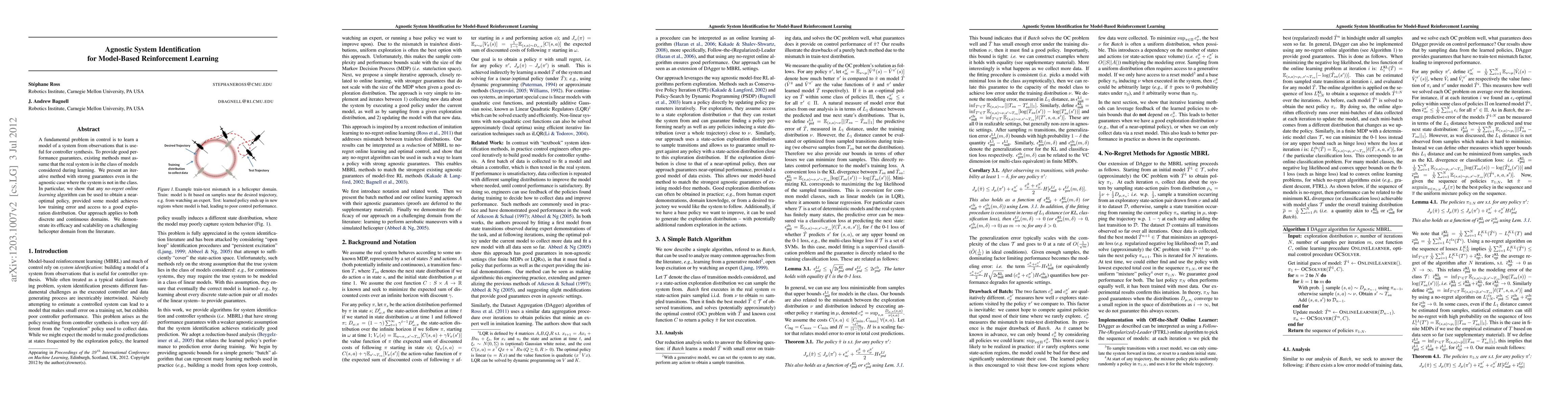 This research introduces an iterative method for agnostic system identification, providing strong performance guarantees even when the real system isn't within the considered model class. It shows that any no-regret online learning algorithm, with low training error and good exploration, can yield a near-optimal policy, applicable to both discrete and continuous domains, and demonstrates its effectiveness on a complex helicopter control task.