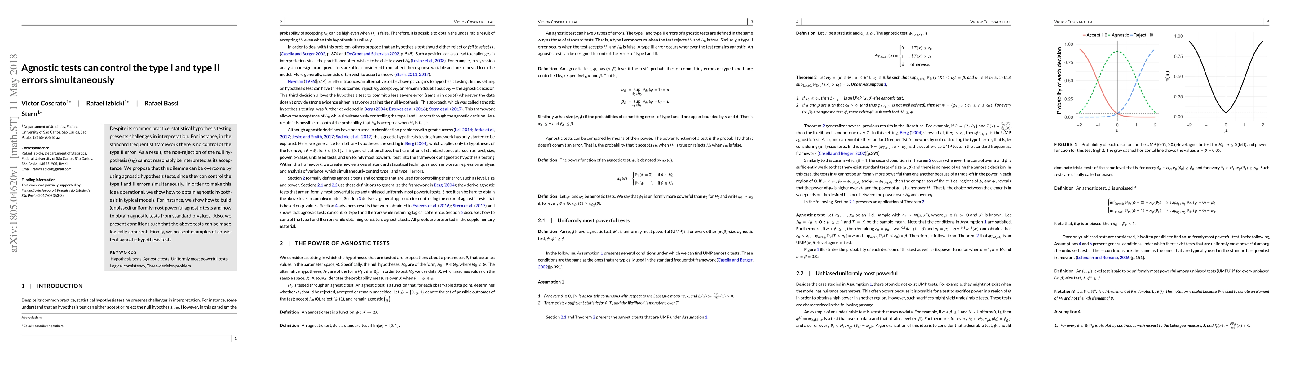 Despite its common practice, statistical hypothesis testing presents challenges in interpretation. For instance, in the standard frequentist framework there is no control of the type II error. As a result, the non-rejection of the null hypothesis cannot reasonably be interpreted as its acceptance. We propose that this dilemma can be overcome by using agnostic hypothesis tests, since they can control the type I and II errors simultaneously. In order to make this idea operational, we show how to obtain agnostic hypothesis in typical models. For instance, we show how to build (unbiased) uniformly most powerful agnostic tests and how to obtain agnostic tests from standard p-values. Also, we present conditions such that the above tests can be made logically coherent. Finally, we present examples of consistent agnostic hypothesis tests.