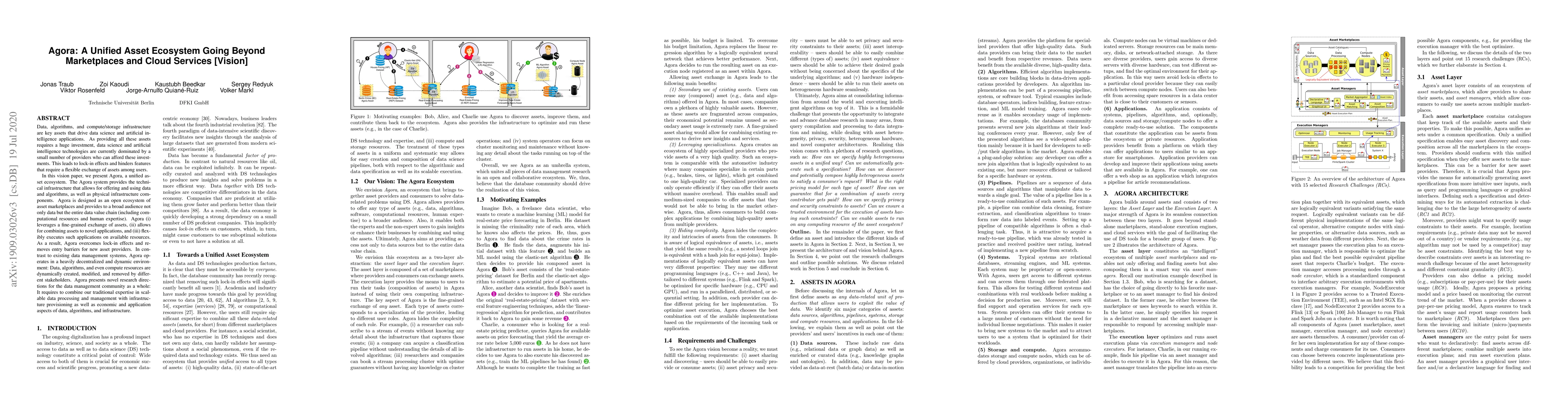 Data, algorithms, and compute/storage infrastructure are key assets that drive data science and artificial intelligence applications. As providing all these assets requires a huge investment, data science and artificial intelligence technologies are currently dominated by a small number of providers who can afford these investments. This leads to lock-in effects and hinders features that require a flexible exchange of assets among users. In this vision paper, we present Agora, a unified asset ecosystem. The Agora system provides the technical infrastructure that allows for offering and using data and algorithms, as well as physical infrastructure components. Agora is designed as an open ecosystem of asset marketplaces and provides to a broad audience not only data but the entire data value chain (including computational resources and human expertise). Agora (i) leverages a fine-grained exchange of assets, (ii) allows for combining assets to novel applications, and (iii) flexibly executes such applications on available resources. As a result, Agora overcomes lock-in effects and removes entry barriers for new asset providers. In contrast to existing data management systems, Agora operates in a heavily decentralized and dynamic environment: Data, algorithms, and even compute resources are dynamically created, modified, and removed by different stakeholders. Agora presents novel research directions for the data management community as a whole: It requires to combine our traditional expertise in scalable data processing and management with infrastructure provisioning as well as economic and application aspects of data, algorithms, and infrastructure.